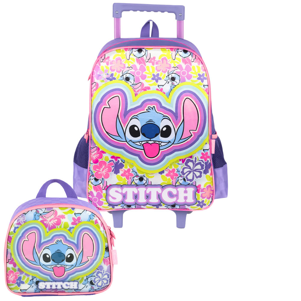Kit Mochila De Rodinhas Lancheira Escolar Stitch Florido