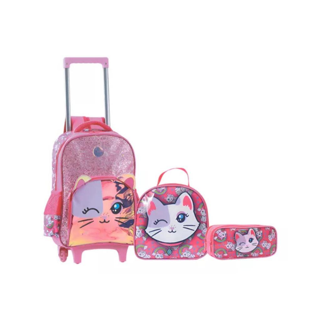 Kit Mochila Escolar Rodinha Gatinha Rosa Roxo Meninas Lancheira Termica Estojo