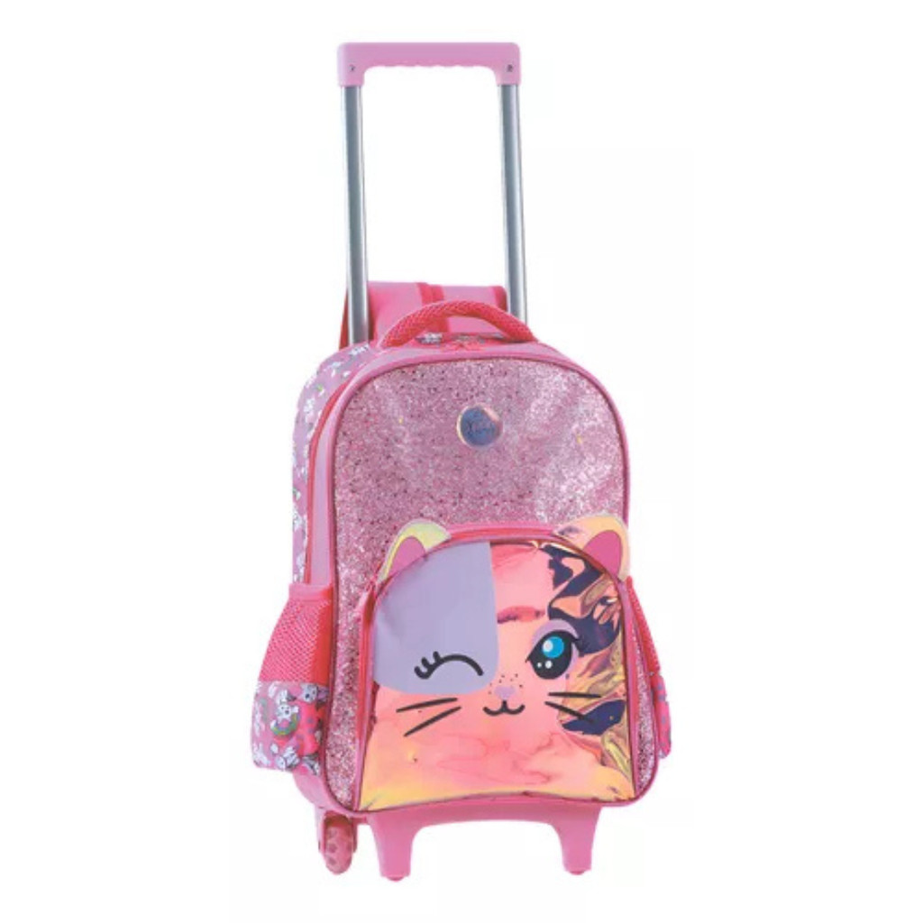 O Kit de Mochila de Rodinha Gatinho Metalizado, inclui um estojo com o mesmo design, perfeito para organizar lápis, canetas e outros materiais escolares, e uma lancheira que mantém a comida fresca e deliciosa. Sua filha vai adorar levar esse conjunto para a escola, tornando-se o destaque entre os colegas.A mochila de rodinhas é prática e fácil de transportar, proporcionando conforto durante todo o trajeto. Este kit é a combinação ideal de funcionalidade e estilo, tornando-o essencial para qualquer criança que adore gatinhos e um toque de brilho em sua vida.Medidas Mochila:Altura: 41 cm;Largura: 29 cm;Comprimento: 12 cm.Medidas Lancheira:Altura: 23 cm;Largura: 22 cm;Comprimento: 11 cm.Medidas Estojo:Altura: 11 cm;Largura: 23 cm;Comprimento: 8 cm.