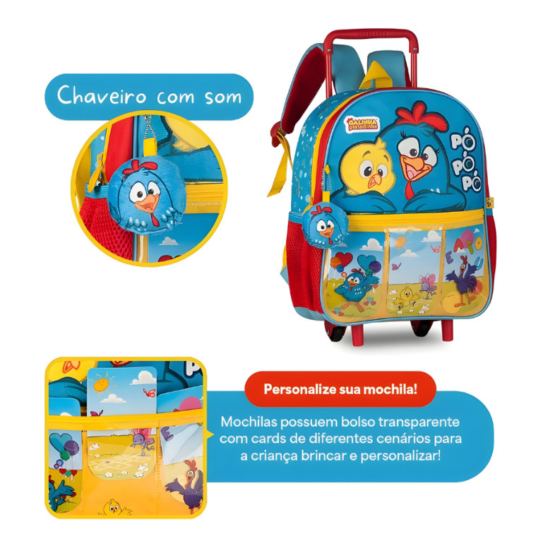 Deixe a rotina escolar muito mais divertida e prática com o Kit Escolar Galinha Pintadinha, perfeito para acompanhar as crianças no dia a dia com conforto, resistência e muito estilo! Este kit é composto por mochila com rodinhas e lancheira combinando, trazendo personagens queridos e um design colorido que encanta os pequenos. Mochila com rodinhas Facilita o transporte e evita peso excessivo nas costas da criança. Bolso lateral para garrafa Praticidade para levar água ou suco sempre à mão. Material de alta qualidade Confeccionado em material resistente, durável e fácil de limpar, ideal para o uso diário. Design oficial Galinha Pintadinha Estampa alegre e licenciada, garantindo qualidade e autenticidade. Envio imediato Produto disponível à pronta entrega. Dimensões Aproximadas Mochila: Altura: 33 cm Largura: 27 cm