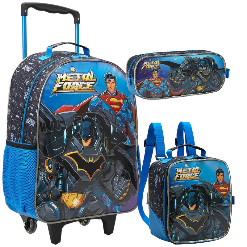 Kit Mochila Infantil Escolar de Rodinhas 16 Batman liga da justiça Lancheira estojo super Man