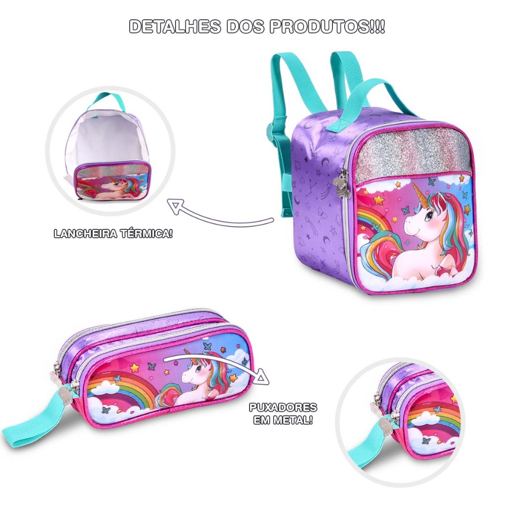A mochila do unicórnio mais colorida e fofa do mundo vai apaixonar as meninas!!! Que tal dar uma olhada na ficha técnica? MOCHILA: - amplo compartimento principal, com espaço para livros, apostilas, cadernos e muita coisa! - bolsos laterais telados, ideais para garrafinhas; - carrinho retrátil; - alças de costas; - puxadores personalizados. LANCHEIRA: - alças reguláveis; - alça de mão; - forração térmica; - puxadores personalizados. ESTOJO: - alça de mão - puxadores personalizados. MEDIDAS (ALTURA x LARGURA x PROFUNDIDADE): - mochila (47cm x 30cm x 15cm) - mochila com carrinho levantado (75cm x 30cm x 15cm) - lancheira (22cm x 20cm x 10cm) - estojo (9cm x 22cm x 7cm)