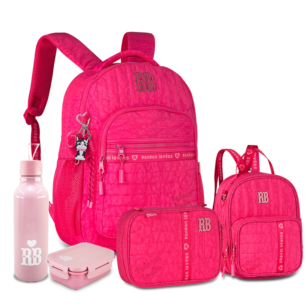 KIT MOCHILA ESTOJO BOX E LANCHEIRA REBECCA BONBON - COLEÇÃO NOVA 2026! ACOMPANHA UMA LINDA SQUEEZE E MARMITA - Os mimos são enviados com cores sortidas conforme a disponibilidade do estoque - - NÃO cobrimos garantia dos mimos - Rebecca Bonbon retorna com as principais tendência para a nova coleção! Aclamada pelas fashionistas, a buldogue mais querida traz todo o glamour e estilo para as meninas com diversas aplicações e acessórios. MOCHILA - Material: Soft - Revestimento interno: Poliéster na cor rosa listrado - Compartimento para notebook e tablete - Logo RB metalizado - Bolsos frontais - Bolsos laterais em redinha - Zípers coloridos e personalizado RB - Bolso Antifurto - Costas acolchoadas - Alça carona - Chaveiro-tag de borracha e penduricalhos - Organizador interno - Estampa personalizada RB - Bordados e silks - Dimensões 44cm X 33cm X 14cm LANCHEIRA - Revestimento interno térmico - Alça de mão - Alça tiracolo - Alça carona - Logo RB em metal - Dimensões: 20cm x 24cm x 14cm ESTOJO - 36 Elásticos - Capacidade de 100 canetas - Zíper com puxador personalizado - Bolso interno - Dimensões: 22cm x 16cm x 6cm E aí, bora arrasar na escola, faculdade ou onde quiser com uma dessas nas costas? Garanta já, e boas compras :)