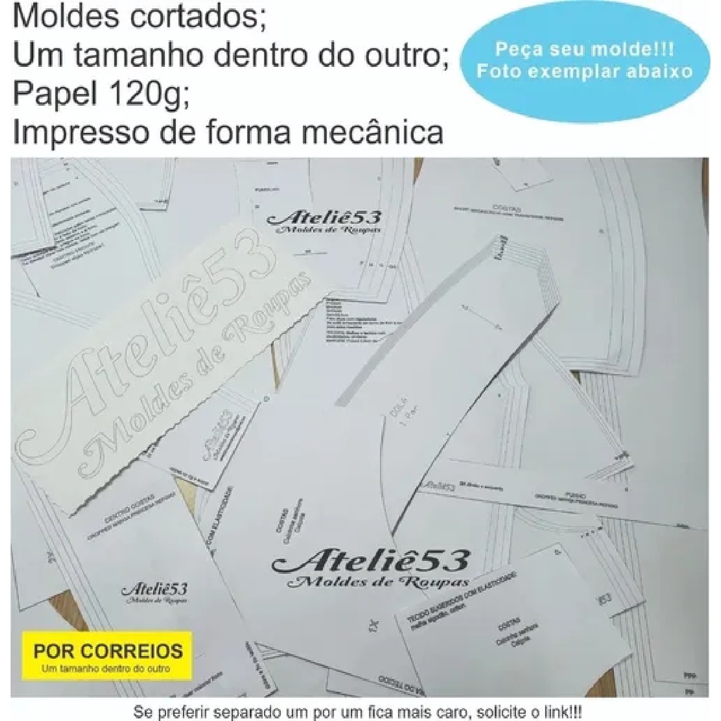 A PRONTA ENTREGA!!!! Moldes testados pela equipe Ateliê53 Moldes de Roupas ESTE MOLDE SERÁ ENVIADO POR CORREIOS COM TODOS OS TAMANHOS SEPARADOS. VOCÊ RECEBERÁ: KIT MOLDES MODELAGEM: KIT ***********Molde Modelagem CUECA BÁSICA MASCULINA TAMNHOS SEPARADOS UM POR UM: P, M, G e GG + MODELAGEM CALCINHA INFANTIL GRADE: 1,2,4,6,8,10,12 e 14. * Impresso de forma mecânica * Papel branco * Gramatura do papel: 120 gramas/m² * SEPARADOS UM POR UM * Veja imagem do molde que você receberá em sua casa no anúncio *Prazo de postagem: fazemos a postagem o mais rápido possível. PRODUTO A PRONTA ENTREGA O molde foi testado e aprovado por uma equipe especializada, por isso tire todas as dúvidas antes. Boas compras e volte sempre!!!