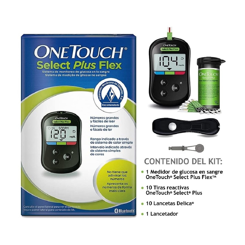 O medidor OneTouch Select Plus Flex ™ ajusta-se às necessidades de cada paciente, pois possui personalização de metas glicêmicas de acordo com a recomendação médica. Conta com a Tecnologia ColorSure ™, trazendo resultados fáceis, rápidos e precisos em que basta olhar as cores para entender o significado dos números. Sendo assim, cada paciente consegue tomar melhores decisões para gerenciar o Diabetes. OneTouch Select Plus Flex ™ vem com o novo Lancetador OneTouch Delica® proporcionando testes mais suaves e confortáveis. O medidor também possui memória para 500 medições, resultados em 5 segundos e display visual amplo com números grandes e fáceis de ler. Esse produto é compatível apenas com as tiras OneTouch Select Plus™. Esta embalagem contém 1 medidor de glicemia, 10 tiras reagentes, 10 lancetas e 1 lancetador.