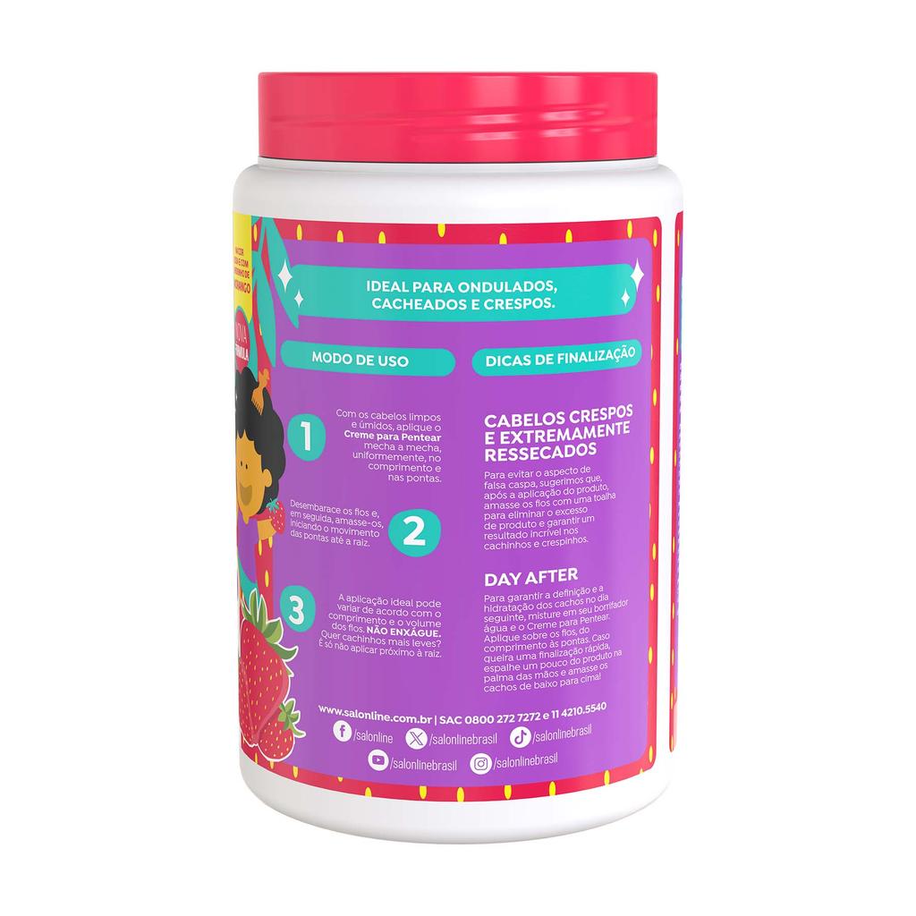 O kit contém 1 Shampoo Morango Kids 300ml, 1 Condicionador 200ml e 1 Creme para Pentear Cachinhos Sem Nós 1kg, a combinação ideal para cuidar dos cachinhos das crianças com hidratação, definição e um cheirinho delicioso de morango. Com fórmulas suaves e dermatologicamente testadas, os produtos proporcionam limpeza delicada, desembaraço, brilho e controle do frizz, deixando os fios macios e cheios de vida. <>INDICAÇÕES$& Para quais tipos de cabelo? Ondulado, Cacheado, Crespo Qual a indicação? embaraçado, desidratado, rígido, com frizz Pode usar a partir de quantos anos? A partir de 03 anos. <>ATIVOS$& Quais os principais ativos? Kit Shampoo e Condicionador Morango #todecacho Kids Sua fórmula possui extrato de frutas vermelhas e óleo de macadâmia. Creme Para Pentear Morango Kids Cachinhos sem Nós Óleo de coco: poderoso ativo hidratante para os cabelos que proporciona maciez e suavidade aos cachinhos das crianças. Óleo de macadâmia: promove brilho e hidratação dos cachinhos. Óleo de semente de melancia: auxilia na nutrição e maciez dos fios. Extrato de frutas vermelhas: possui propriedades emolientes e nutritivas para os cabelos. <>MODO DE USO$& Qual a melhor forma de usar? Kit Shampoo e Condicionador Morango Shampoo Cabelo e Corpo Desembaraçante Aplique o Shampoo Cabelo e Corpo Desembaraçante #todecacho Kids na pele ou nos cabelos. Massageie suavemente até formar espuma. Enxágue. Se necessário, repita a aplicação. Condicionador + Máscara de Tratamento Condicionador: Após o shampoo, aplique uniformemente no cabelo úmido por toda extensão dos fios. Massageie e deixe agir entre 1 e 3 minutos. Enxágue. Máscara de Tratamento: Aplique do comprimento às pontas dos fios. Deixe agir durante 3 a 5 minutos. Enxágue. Gelatina Morango Com os cabelos limpos e úmidos, aplique o creme mecha a mecha, uniformemente, no comprimento e pontas. Desembarace os fios com um pente de dentes largos e, em seguida, amasse-os, iniciando o movimento das pontas até a raiz. Repita o movimento quantas vezes forem necessárias. Não enxágue.. <>CARACTERÍSTICAS$& É produto vegano? Todos os produtos são veganos. É liberado? Nenhum dos produtos é liberado.