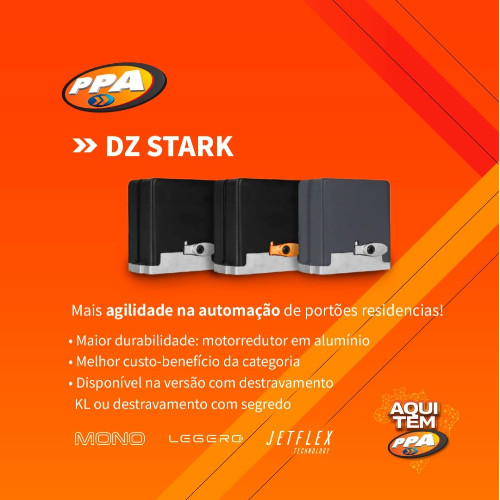 Kit Motor Portão Eletrônico Ppa Dz Stark 750 1/2hp Jetflex 60hz Z18 127/220V - 3m cremalheira - kit de instalação - 2 controles remotos MODELO LANÇAMENTO PPA (STONE 3 BOTÕES) ✅ KIT MOTOR TESTADO E PRONTO PARA INSTALAR (recomendamos a instalação por profissionais qualificados PPA) ✅ CONTROLES JÁ CODIFICADOS ✅ ENVIAMOS COM EXCLUSIVA TECNOLOGIA ANTI CLONAGEM ✅ PRODUTO ORIGINAL PPA. AUTOMATIZADOR DZ STARK 750 1/2HP Z18 JETFLEX PPA Projetada para oferecer ainda mais força e velocidade, este modelo também proporciona segurança e facilidade para o instalador. Possuindo uma mecânica reforçada para alta performance e durabilidade, o automatizador também permite o máximo controle de seu movimento. Com conector para módulo wifi PPA ON você poderá abrir e fechar o seu portão pelo seu celular, através do aplicativo PPA ON. Este mesmo aplicativo possui muitos outros acessórios que compõe a família de itens da casa inteligente (Módulo PPA ON vendido separadamente). ESPECIFICAÇÕES TÉCNICAS Alimentação: 127V/220V - 60Hz (Bivolt) Peso do portão: 750Kg Redução: 1:30 Tempo de abertura/fechamento: 4 segundos Quantidade de ciclos/hora: 35 Frequência de saída: 200Hz (máxima) Rotação do motor (RPM): 5800 (máxima) Fim de curso: Híbrido (digital/analógico) Engrenagem externa: Z18 em alumínio Coroa interna: Nylon com alma metálica Fechadura metálica com 2 chaves de destravamento *A velocidade pode variar de acordo com o tamanho, peso e estado do portão, além dos ajustes de desaceleração. CONTEÚDO DO PRODUTO 01 Automatizador para portões deslizantes DZ STARK 750 JETFLEX PPA 02 Controles remotos STONE PPA com bateria inclusa 01 Central de comando TRIFLEX FACILITY PPA (já instalada) 02 Ímãs com suporte para o sensor fim de curso 02 Chaves de destravamento 03 Metros de cremalheira 50cm cada (6 peças) Acompanha manual em português. Garantia de fábrica: 30 dias