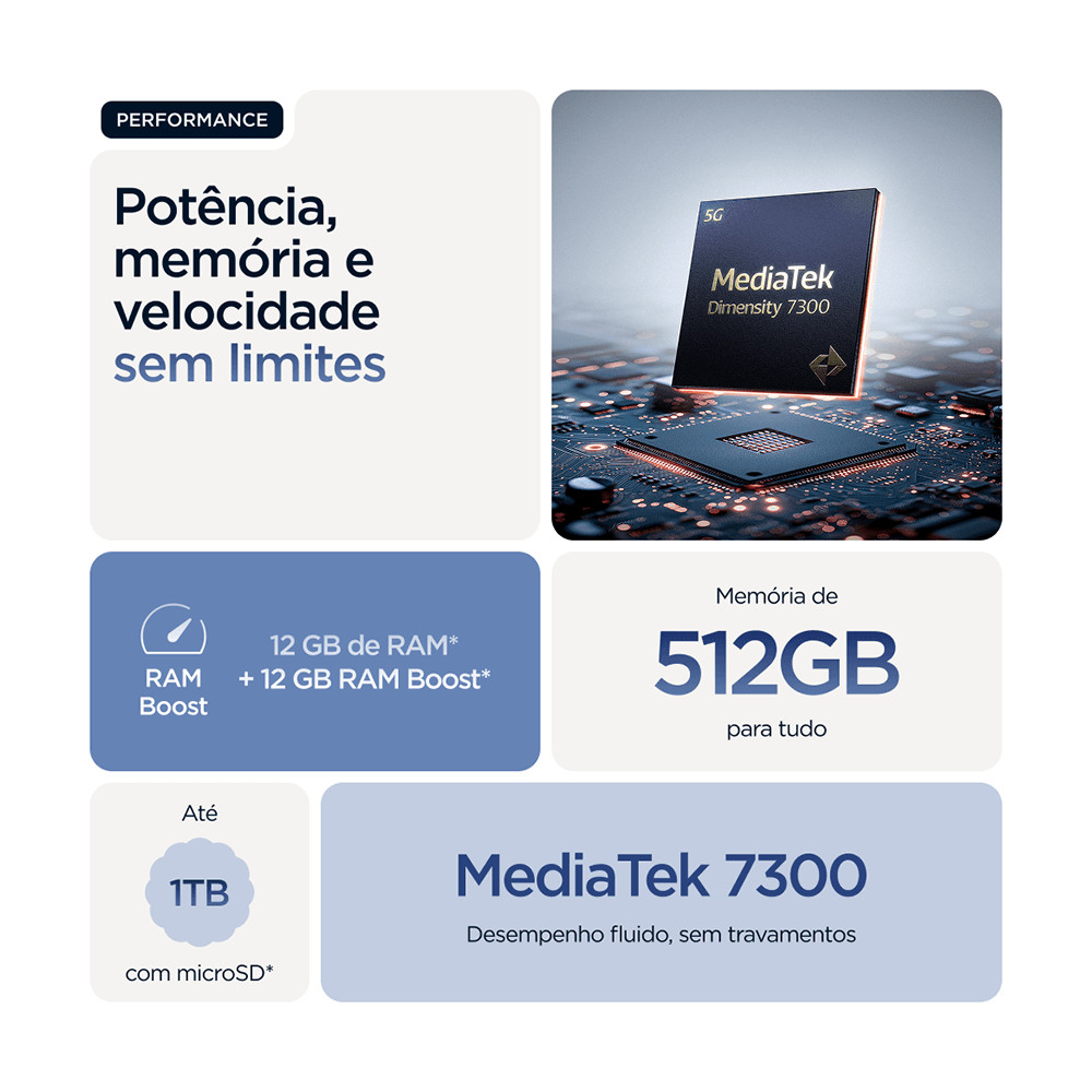 Performance Extrema e Espaço Gigante: Equipado com o processador MediaTek Dimensity 7300, o Edge 60 entrega velocidade total para multitarefa e jogos. Com impressionantes 512 GB de espaço e até 24 GB de RAM (12 GB física + 12 GB RAM Boost), você armazena tudo o que precisa e alterna entre aplicativos pesados com fluidez absoluta e zero travamentos. Fotografia Profissional com Zoom Óptico: Capture detalhes perfeitos com o sensor Sony LYTIA™ 700C de 50 MP e a inteligência da Moto AI. O grande diferencial é a lente teleobjetiva com Zoom Óptico de 3x, que aproxima o que está longe sem perder qualidade. Com câmeras de 50 MP na traseira (Ultra-wide/Macro) e na frontal, seus registros terão nível cinematográfico. A Tela Mais Brilhante da Categoria: A tela pOLED de 6,7" Super HD oferece uma imersão total com design Quad-Curve. Com um brilho recorde de 4.500 nits, você enxerga tudo com clareza mesmo sob sol forte. As cores são validadas pela Pantone™, garantindo fidelidade real de tons e movimentos ultrafluidos com a taxa de atualização de 120 Hz. Resistência Militar e À Prova D'água: Sofisticado e indestrutível, o Edge 60 possui certificação militar e proteção IP68/IP69, sendo resistente a quedas, poeira e mergulhos na água. O acabamento premium em conjunto com o vidro Gorilla Glass 7i garante que o aparelho suporte os imprevistos do dia a dia sem perder a elegância. Energia para o Dia Todo em Minutos: A superbateria de 5200 mAh acompanha seu ritmo por até 40 horas. E se o tempo for curto, o carregador TurboPower™ de 68W garante carga para um dia inteiro em apenas 8 minutos. É a liberdade de usar seu smartphone ao máximo, com a inteligência do novo Android 15.