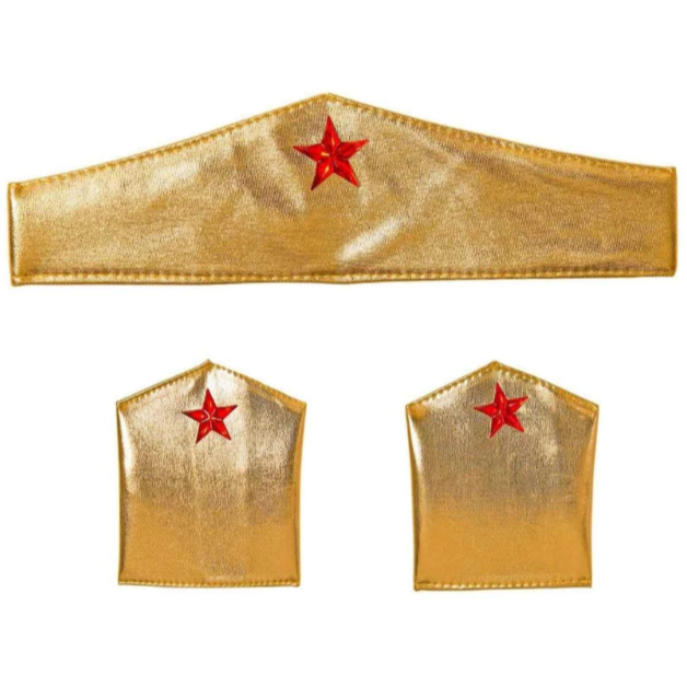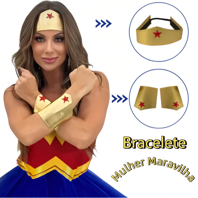 Kit Mulher Maravilha Cosplay Fantasia Heroína com Tiara e 2 Braceletes Dourados