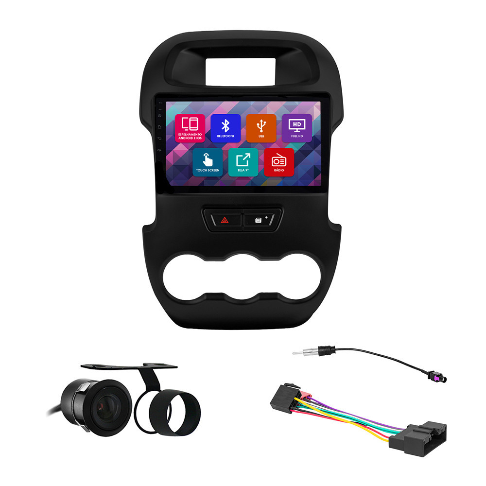 Kit Multimídia 9 Pol Ranger 2010 2011 2012 2013 2014 Espelhamento Android Ios 2 Din Preto Camera Ré