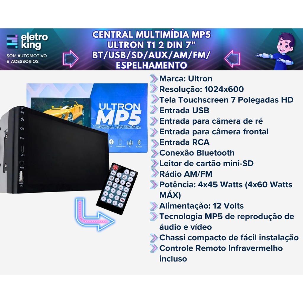 Seja bem-vindo à eletroking, leia atentamente a descrição do produto abaixo antes da compra, qualquer dúvida, nos acione no campo de perguntas do anúncio. Central Multimídia MP5 7 Ultron Bluetooth/USB/Espelhamento Cobalt 12/16 Moldura Preta Descubra a Central Multimídia MP5 Ultron T1 com tela touchscreen de 7 polegadas, perfeita para acessar seus aplicativos favoritos diretamente do seu smartphone via espelhamento para Android e iOS. Com recursos avançados, esta central reproduz áudio e vídeo em diversos formatos, oferece conexão Bluetooth, entrada USB e suporte para câmera de ré, proporcionando uma experiência completa e prática. Incluímos também uma moldura 2 din de 7 polegadas projetada especificamente para proporcionar um encaixe perfeito e acabamento elegante. Especificações Técnicas: Central Multimídia MP5 Ultron T1 2 Din 7 BT/USB/SD/AUX/AM/FM/Espelhamento • Tecnologia MP5 de reprodução de áudio e vídeo; • Reprodução nos formatos: RMVB, MPG4, DIVX, AVI, MP3, MP4, MP5, MPEG E JPEG; • Tela Digital Touchscreen de 7 Polegadas HD • Resolução: 1024x600 • Controle Remoto Infravermelho incluso • Chassi compacto de fácil instalação • Entrada USB • Entrada para câmera de ré • Entrada para câmera frontal • Entrada RCA • Equalizador • Botões RGB Multi Color • Conexão Bluetooth • Leitor de cartão mini-SD • SWC (Compatível com sistemas de comando de volante) • Rádio AM/FM • Potência: 4x45 Watts (4x60 Watts MÁX) • Alimentação: 12 Volts Moldura 2 Din 7 Cobalt 2012 a 2016 - Fiamon • Abertura no Modelo 2 Din • 7 Polegadas • Produzido em ABS Injetado Resistente • Alta Resistência e Excelente Durabilidade • Cor Disponível: Preta • Tonalidade Preta Fiel à Original do Carro • Encaixe Sob Medida • Acabamento Impecável • Fácil Instalação Conteúdo da Embalagem: • 01 Central Multimídia MP5 Ultron T1 2 Din 7 • 01 Moldura 2 Din 7 Cobalt 2012 a 2016 • Fios para instalação • Manuais Compatível com Cobalt 2012 2013 2014 2015 2016 Importante: • Garantia de 273 Dias • Valor do kit • Todos os Nossos Produtos São Novos, Originais e Acompanham Nota Fiscal. • A eletroking recomenda que a instalação seja feita por profissional especializado e não se responsabiliza pelo mau uso do produto.