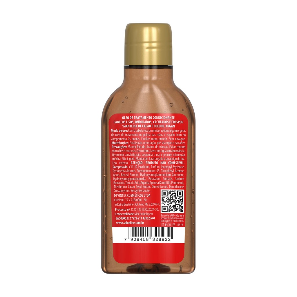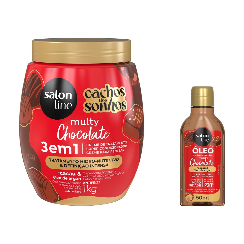 O kit contém 1 Creme de Tratamento Multy Chocolate 1kg e 1 Óleo de Tratamento Multy Chocolate Condicionante 50ml da linha Cachos dos Sonhos, a combinação ideal para proporcionar nutrição profunda, brilho e maciez aos cabelos cacheados. <>INDICAÇÕES$& Para quais tipos de cabelo? Cacheado, Crespo. Qual a indicação? desnutrido, desidratado, com frizz, sem definição. Pode usar a partir de quantos anos? A partir de 12 anos. <>ATIVOS$& Quais os principais ativos? Creme de Tratamento Chocolate 3 em 1 e Óleo de Tratamento Chocolate Multy Cachos dos Sonhos Manteiga de Cacau:nutre profundamente, suaviza os fios e combate o ressecamento. Óleo de Argan: evita a perda de água natural dos fios, promove hidratação e nutrição. <>MODO DE USO$& Qual a melhor forma de usar? Creme de Tratamento Chocolate 3 em 1 Creme de tratamento: Com os cabelos limpos e úmidos, aplique o produto mecha a mecha, enluvando os fios da raiz até as pontas. Deixe agir por 5 minutos e enxágue bem. Condicionador: Com os cabelos limpos e úmidos, aplique o produto e massageie os fios do comprimento até as pontas. Enxágue bem. Creme para pentear: Com os cabelos limpos e úmidos, aplique o produto mecha a mecha, uniformemente, no comprimento e nas pontas. Desembarace os fios com um pente de dentes largos e amasse-os, iniciando o movimento das pontas até a raiz. A aplicação ideal dependerá da quantidade e do comprimento dos fios. Não enxágue. u> Óleo de Tratamento Chocolate Multy Com o cabelo seco ou úmido, aplique algumas gotas do óleo na palma das mãos e espalhe bem do comprimento às pontas. Finalize como preferir. Sem enxágue. <>CARACTERÍSTICAS$& É produto vegano? Todos os produtos são veganos. É liberado? Nenhum dos produtos são liberados.