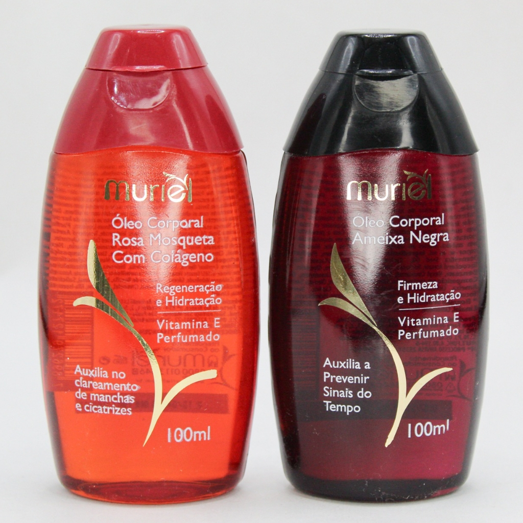 Kit Óleos Corporais Muriel – Rosa Mosqueta + Ameixa Negra (2x100ml) Cuidado completo: regeneração, hidratação profunda e perfume marcante. O Kit Muriel Rosa Mosqueta + Ameixa Negra reúne dois dos óleos corporais mais amados da marca em uma combinação perfeita para quem busca pele saudável, macia e radiante todos os dias. Cada óleo oferece benefícios únicos, com texturas leves, rápida absorção e fórmulas veganas. - Óleo Corporal Rosa Mosqueta com Colágeno (100ml) Rico em colágeno e vitamina E Estimula a regeneração da pele Auxilia no clareamento de manchas e marcas Ideal para uso pós-banho ou após exposição solar - Óleo Corporal Ameixa Negra (100ml) Ação antioxidante potente com vitamina E Hidrata profundamente e protege contra o envelhecimento precoce Perfume envolvente e duradouro Textura sedosa e toque seco - Benefícios do Kit: ✔ Combina regeneração + nutrição antioxidante ✔ Fórmulas leves, não oleosas e de rápida absorção ✔ Fragrâncias delicadas e marcantes ✔ Ideal para todos os tipos de pele ✔ Vegano, sem crueldade e com embalagem reciclável