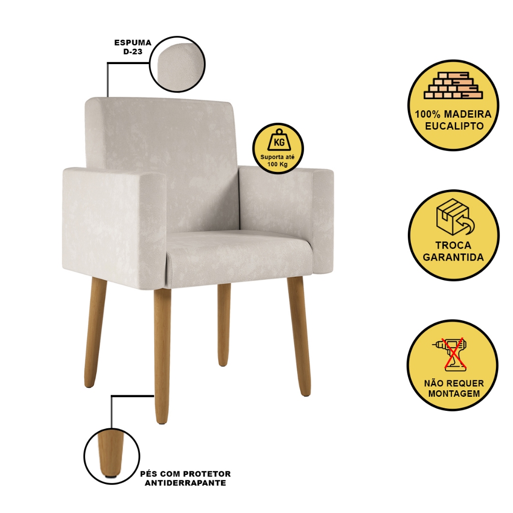 Transforme o seu ambiente com o Kit 2 Poltronas + Namoradeira Nina Pé Palito Este kit é a combinação perfeita de conforto, durabilidade e um design moderno, ideal para mesas de jantar, áreas de estar e até mesmo ambientes comerciais. Especificações do produto Tecido em Suede, 100% poliéster Espuma D-23 com Alta densidade Percintas Elásticas que oferecem suporte adicional Estrutura de madeira eucalipto proveniente de reflorestamento Informações Técnicas da Poltrona Altura: 87 cm Largura: 61 cm Profundidade: 60 cm Peso: 9,5 kg Capacidade de Suporte: A poltrona suporta até 100 kg e a namoradeira até 150 kg. Produto embalado Altura: 55 cm Largura: 177 cm Profundidade: 61 cm Peso: 32,5 kg Observações Importantes O produto tem 3 meses de garantia contra defeitos de fabricação Produto possui uma embalagem segura, feita para evitar danos durante o transporte O Produto entregue é montado A cor real pode variar ligeiramente devido às configurações da tela e ao tratamento das imagens O Prazo de envio é de 5 dias úteis após a confirmação da compra e enviamos para todo o Brasil Perguntas Frequentes Como devo limpar? Realizar a limpeza do tecido com um pano seco ou levemente umedecido Quantos produtos irei receber nesta compra? Você receberá 2 volumes, ou seja, duas Poltronas e uma Namoradeira Nina Pé Palito Para mais informações ou assistência com sua compra, nossa equipe está à disposição para ajudar
