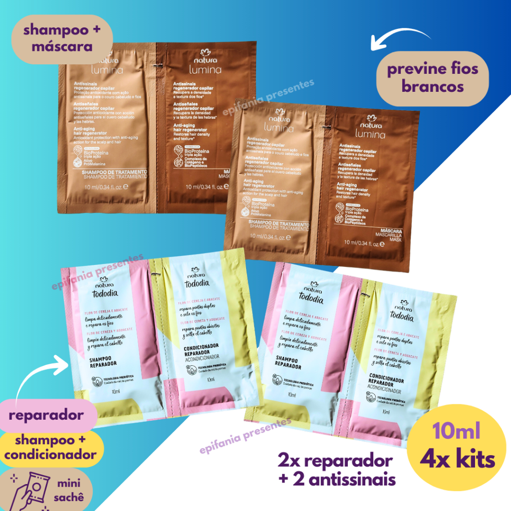 Amostra Natura Lumina Mini Sachê Cronograma Capilar, Antissinais, Reconstrução, Liso Prolongado, entre outros. Escolha seu kit nas variações — tratamento na dose certa! Tratamento na dose certa — perfeito para levar na bolsa ou em viagens, ocupando muito menos espaço. Seu cabelo sempre lindo, hidratado e perfumado, onde quer que você vá! Data de Validade: Linha Lumina - 11/2027 Linha Todo Dia - 01/2028 Cronograma Capilar- 04/2028 Perfeitos para testar, conhecer novos produtos e descobrir o que mais te agrada! Por que escolher nossas amostras: ✅ Produtos 100% originais e lacrados ✅ Variedade de linhas Avon e Natura ✅ Ideais para testar antes de comprar o tamanho original ✅ Perfeitos para presentear, colecionar ou levar na bolsa ✅ Praticidade, economia e qualidade Perfumes, cremes, séruns e hidratantes em mini sachês! ✅ Práticos e ideais para viagens 📦 Embalagem: Sachês, mini frascos ou tubinhos de amostra 📆 Validade: Longa e conforme o lote do fabricante 🚚 Envio rápido e embalado com todo cuidado Os kits são enviados exatamente como nas fotos reais do anúncio. Não realizamos alterações nas combinações ou substituições de produtos. Todos os kits são selados em plástico e previamente montados para garantir que cheguem intactos, organizados e com total higiene até a sua casa.