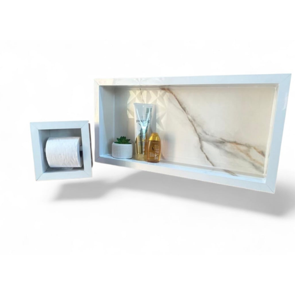 KIT NICHO + PORTA PAPEL HIGIENICO EM PORCELANATO DE ALTA QUALIDADE PORCELANATO PREMIUM PRIMEIRA LINHA TRANSFORME SEU BANHEIRO COM ELEGANCIA ENVIO FULL MEIDADAS DO NICHO 60X30 PORTA PAPEL 15X17 AGRADEÇEMOS SUA COMPRA