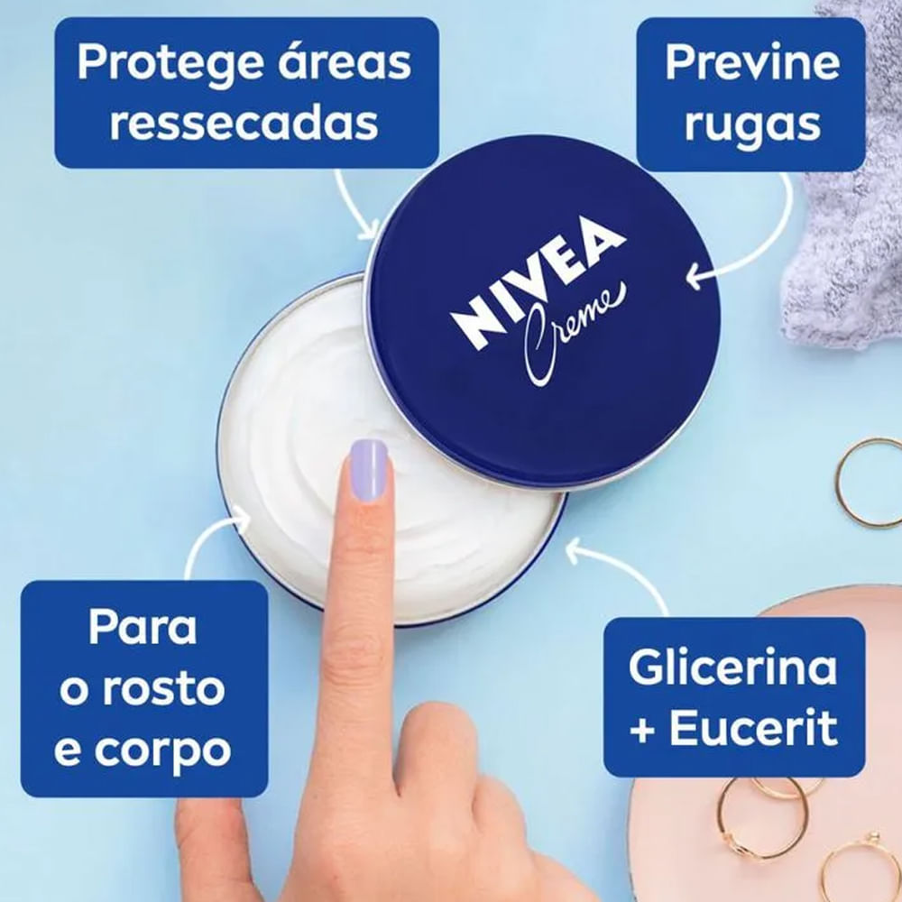 O Kit Nivea Original Care + Creme Nivea Latinha Azul oferece hidratação completa para os lábios e para a pele. O Hidratante Labial Nivea Original Care garante até 24 horas de hidratação intensa, mantendo os lábios macios, protegidos e livres do ressecamento. Sua fórmula é enriquecida com óleos naturais, possui embalagem reciclável e é livre de óleos minerais. Já o Creme Nivea Latinha Azul é um clássico que protege e hidrata profundamente até as áreas mais ressecadas do corpo, proporcionando maciez e cuidado diário. Contém no kit: • Creme Hidratante Nivea Latinha Azul 29g - 1 Unidade • Hidratante Labial Nivea Amora Shine 4,8g - 1 Unidade Benefícios: • Hidratação intensa dos lábios por até 24 horas • Fórmula com óleos naturais e embalagem reciclável • Lábios protegidos contra o ressecamento • Hidratação profunda para a pele com o Creme Nivea • Textura cremosa e alto poder de nutrição Modo de uso: • Aplique o hidratante labial nos lábios sempre que sentir necessidade. • Para o creme, espalhe sobre a pele limpa em regiões que necessitem de hidratação intensa, massageando até completa absorção. Sobre a marca: Marca nº 1 de cuidados com a pele no mundo, seu pioneirismo e sucesso fazem da NIVEA uma marca que sempre dita tendências de inovação. O cuidado com as pessoas, há mais de 100 anos, e a segurança do consumidor são as nossas prioridades. A NIVEA conta com mais de 500 itens em seu portfólio que valorizam a individualidade e necessidades de cada tipo de pele. • Para lábios e pele protegidos e hidratados por muito mais tempo!!