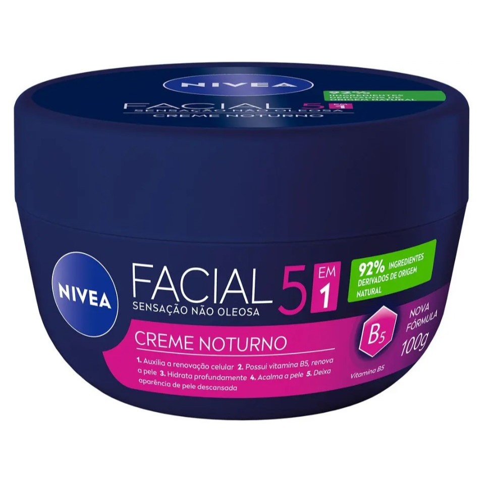 KIT NIVEA Creme Facial Antissinais 100g + Creme Facial Noturno 100g O que é? NIVEA Creme Facial Antissinais é um hidratante facial diário que reduz sinais e linhas de expressão. Para que serve? Com uma fórmula leve e de rápida absorção, este creme proporciona uma hidratação intensa de até 30 horas e o mais importante: sem deixar a pele com aspecto oleoso. Por possuir ingredientes hidro nutrientes e Vitamina E, NIVEA Creme Facial Antissinais previne as rugas, melhora a cicatrização e ainda protege a pele contra os raios UVA/UVB. Além disso, sua fórmula exclusiva firma a pele e ainda reduz linhas de expressão, deixando-a muito mais jovem e saudável. Benefícios e diferenciais - Firma e reduz linhas de expressão - Protege contra os raios UVA/UVB - Fórmula leve de rápida absorção - Hidratação intensa sem deixar a pele oleosa - Melhora a cicatrização Como usar o Creme Facial NIVEA Antissinais? Com a pele limpa e seca, aplique em todo o rosto, massageando suavemente em movimentos circulares até o produto ser absorvido. Uma unidade de embalagem contém 100g - - NIVEA Creme Facial Noturno 5 em 1 é um creme ideal para quem busca uma pele revitalizada. De sensação não oleosa, proporciona hidratação intensa e acalma a pele. Para que serve? Com ação contínua durante a noite, NIVEA Creme Facial Noturno 5 em 1 é responsável por auxiliar na renovação celular da pele. Além disso, este produto promove uma aparência muito mais descansada para a pele do rosto que, durante o dia, acaba sofrendo por diversas condições da rotina, como por exemplo a exposição à poluição. Sua fórmula, enriquecida com vitamina B5, não possui parabenos e hidrata profundamente. Benefícios e diferenciais - Auxilia a renovação celular - Hidrata profundamente - Rápida absorção - Enriquecido com Vitamina B5 - Textura leve INDICAÇÃO Todos os tipos de pele MODO DE USO 1) LIMPEZA Lavar o rosto com o NIVEA Sabonete Facial de sua preferência. 2) TÔNICO Aplique o NIVEA Tônico de acordo com o seu tipo de pele. 3) HIDRATAÇÃO Aplique o NIVEA Creme Facial Noturno no rosto todas as noites. INGREDIENTES Aqua, Glycerin, Butyrospermum Parkii Butter, Cetyl Palmitate, Olus Oil, Cetyl Alcohol, Isopropyl Palmitate, Panthenol, Sodium Polyacrylate, Dimethicone, Sodium Hydroxide, Phenoxyethanol, Ethylhexylglycerin, Linalool, d-Limonene, Citronellol, Geraniol, Benzyl Alcohol, Alpha-Isomethyl Ionone, Parfum