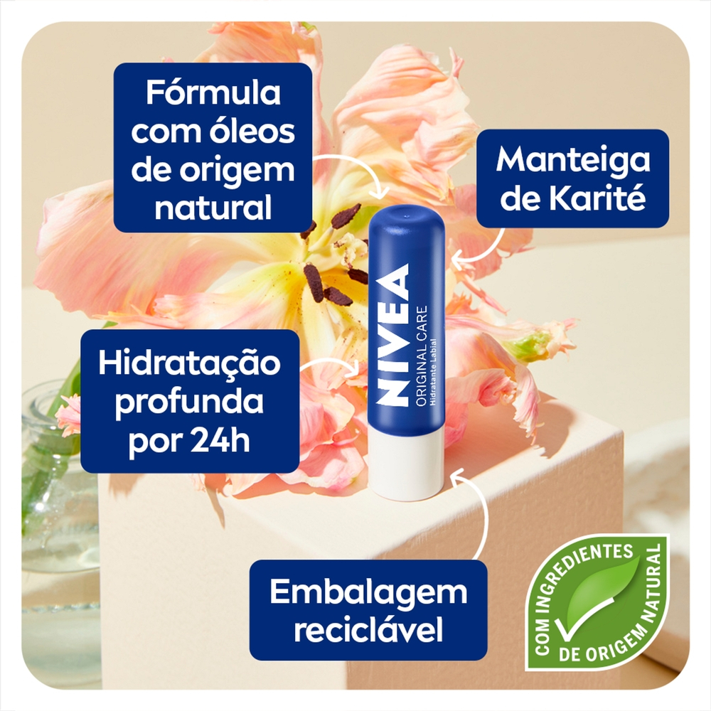 O que é? NIVEA Hidratante Labial é essencial para manter os lábios macios e protegidos por 24 horas Para que serve? Sua fórmula com óleos naturais proporciona hidratação intensa, defendendo contra condições adversas como frio, vento e clima seco. Este hidratante labial é enriquecido com manteiga de karité e garante uma aplicação uniforme sem necessidade de espelho. Além de cuidar dos lábios, também é amigo do meio ambiente, com embalagem reciclável. Livre de óleos minerais, é uma escolha saudável para os seus lábios. Mantenha-os sempre radiantes e confortáveis com NIVEA Hidratante Labial. Um aliado diário para lábios irresistíveis. Benefícios e diferenciais - Livre de óleos minerais - Aplicação uniforme sem precisar de espelho - Embalagem reciclável - Com óleos de abacate e de jojoba - Com manteiga de Karité Como usar o Hidratante Labial NIVEA ? Deslize o produto sobre os lábios. Reaplique sempre que necessário. Uma unidade de embalagem contém 4,8g"