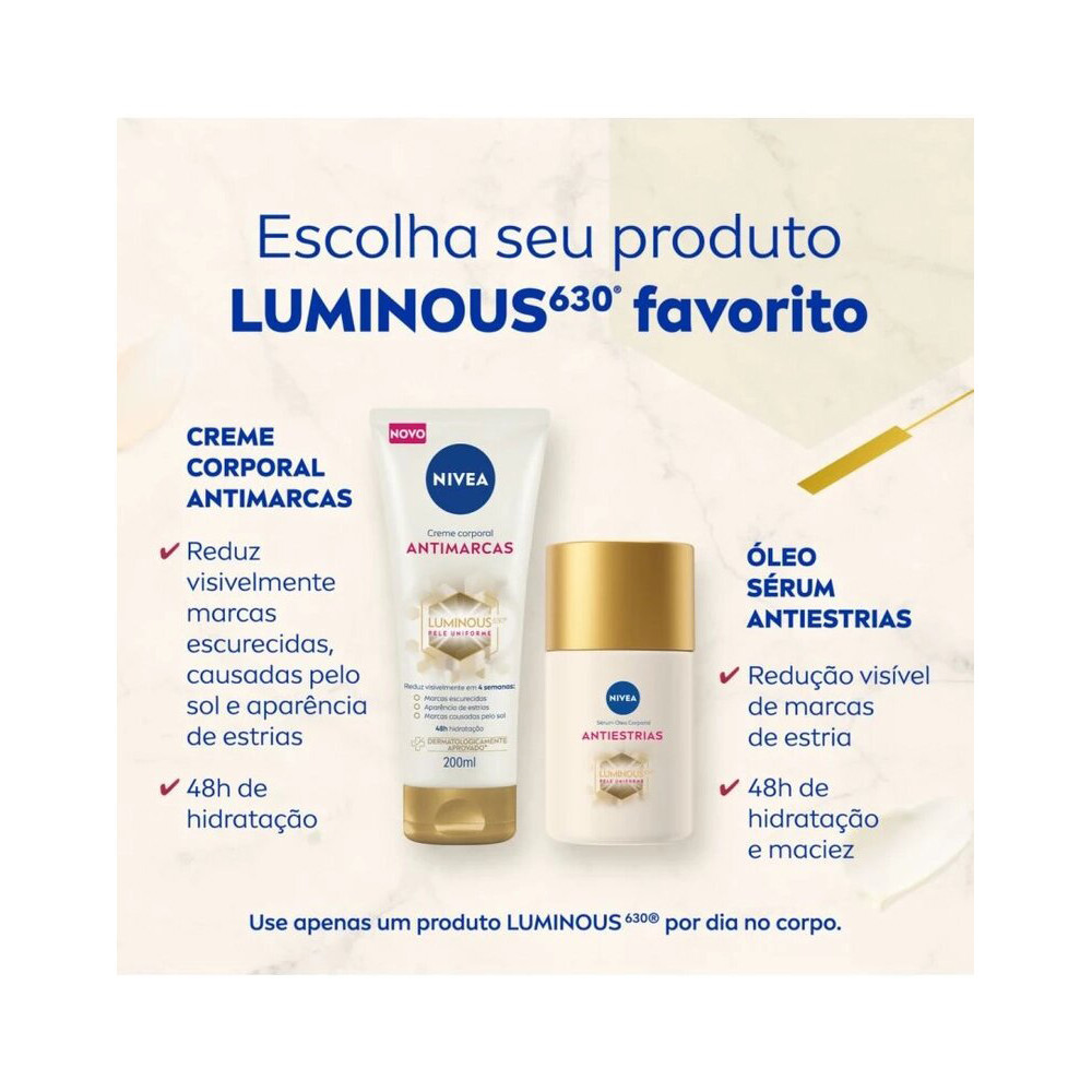ESTE KIT CONTÉM 1 CREME CORPORAL NIVEA LUMINOUS 630 ANTI MARCAS 200ML 1 SÉRUM ÓLEO CORPORAL NIVEA LUMINOUS 630 ANTIESTRIAS 100ML Creme Corporal Antimarcas é um hidratante potente com ação nutritiva profunda combinado com o ativo LUMINOUS 630 que reduz visivelmente marcas da pele causadas por alterações hormonais e alterações de peso, e marcas de sol. Sua textura leve facilita espalhar e massagear a região, potencializando a absorção e eficácia. Seu uso contínuo previne o surgimento de novas marcas. Compatível com todos os tipos de pele, o creme foi clinicamente testado e aprovado. Sérum Óleo Corporal Antiestrias é um óleo corporal que promove 48 horas de hidratação enquanto combate marcas escurecidas, além da sensação de maciez nas marcas de estrias, que combinado com o ativo LUMINOUS 630, reduz visivelmente marcas de estrias causadas por gravidez, alterações hormonais e alterações de peso, e marcas de sol. Compatível com todos os tipos de pele, o creme foi clinicamente testado e aprovado. Benefícios e diferenciais - Uniformiza o tom da pele - Reduz marcas de estrias - Reduz marcas de sol - Compatível com todos os tipos de pele - 48h de hidratação - Dermatologicamente testado - Primeiros resultados visíveis em duas semanas. - Age desde o primeiro dia. Também é eficaz contra marcas antigas. - Reduz significativamente a aparência de estrias que podem surgir por fatores como gravidez, alterações hormonais e de peso. - Previne o aparecimento de estrias com o uso regular. - Sensação de maciez e 48h de hidratação. Modo de Uso Aplique o produto e massageie as áreas afetadas. Não use no rosto. USE SOMENTE UM PRODUTO COM LUMINOUS 630 NO SEU CORPO POR DIA.