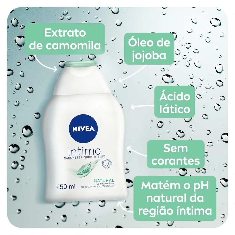 O que é? NIVEA Sabonete Líquido Íntimo Natural é um produto especialmente desenvolvido para a higiene íntima diária. Para que serve? Este sabonete íntimo é ideal para mulheres que desejam manter a saúde e o bem-estar da sua zona íntima. Sua fórmula suave, livre de corantes e propriedades alcalinas, contém extrato de camomila e panthenol, que ajudam a acalmar e prevenir irritações. Dermatologicamente e ginecologicamente testado, este sabonete proporciona uma limpeza suave e eficaz, ao mesmo tempo em que protege e cuida da região íntima. Além disso, o ácido lático presente na sua composição auxilia na manutenção do pH natural da região, proporcionando uma sensação de conforto, limpeza e proteção ao longo do dia. - Livre de corantes e propriedades alcalinas - Cuidado suave para um conforto diário - Fórmula enriquecida com Jojoba, Camomila e Ácido Lático INDICAÇÃO Todos os tipos de pele - Dermatologicamente e ginecologicamente testado - Mantém o PH natural da região íntima