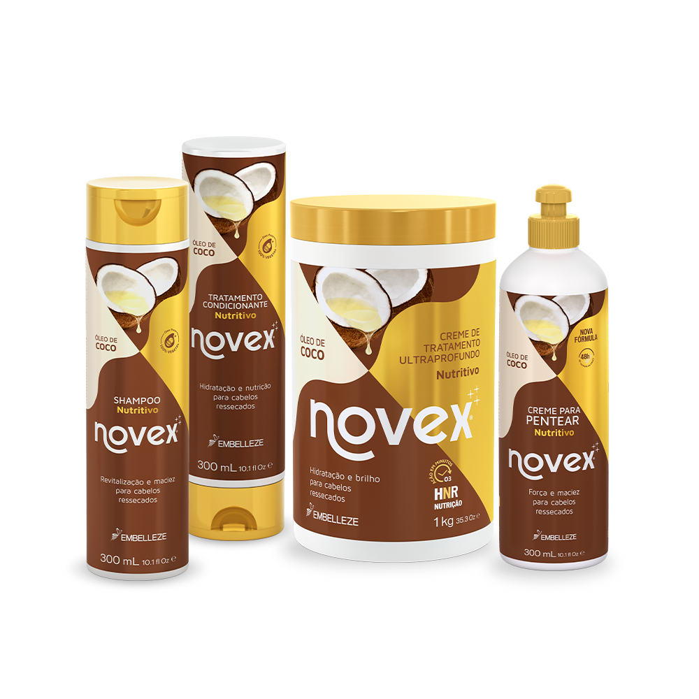 Sobre o produto: Você poderosa para brilhar Novex busca os melhores ativos para enriquecer cada vez mais o seu ritual de beleza. Por isso apresentamos a inovação que vai conquistar você e seus cabelos: Novex Óleo de Coco. As cores, o ritmo, os sabores e as belezas do Brasil sempre fizeram sucesso mundo afora. E um dos grandes segredos dessa beleza tropical é o Coco. Esse fruto além de ser famoso por suas propriedades alimentícias, cada vez mais se destaca na indústria de beleza. Sua ação nutritiva é ideal para todos os tipos de cabelos. Além de agir penetrando profundamente nos fios, o Óleo de Coco é excelente para trazer mais maciez, hidratação, proteção e um brilho que vai deixar você poderosa e os seus cabelos radiantes como o mais belo pôr do sol. Este Kit Contém: 1 Shampoo Novex Óleo de Coco 300ML 1 Condicionador Novex Óleo de Coco 300ML 1 Creme de Tratamento Novex Óleo de Coco 1KG 1 Creme para Pentear Novex Óleo de Coco 300G Indicação: Indicado para cabelos lisos, cacheados, secos, mistos, com química e pintados. Ação: Shampoo: Lava, hidrata, nutre e dá brilho. Condicionador: Hidrata, nutre, revitaliza e dá brilho. Creme de Tratamento: Penetra profundamente nos fios, hidrata, nutre e dá maciez, proteção e brilho. Creme para Pentear: Age nutrindo profundamente os fios, combatendo as pontas duplas, o frizz, protegendo do sol e deixando os cabelos muito macios e cheios de brilho. Ativos: Óleo de Coco. Benefícios: Que a água de coco é uma maravilha todos nós sabemos. Que a polpa do coco é deliciosa, também não é segredo para ninguém. Mas além disso, o óleo do coco traz muitos benefícios para a saúde e beleza dos cabelos. Sua ação nutritiva é ideal para todos os tipos de cabelos. Além de agir penetrando profundamente nos fios, o Óleo de Coco é excelente para trazer mais maciez, hidratação, proteção e um brilho que vai deixar você poderosa e os seus cabelos radiantes como o mais belo pôr do sol. Resultado: Você poderosa para brilhar. Modo de Uso: 1 - Coloque um pouco do Shampoo Vitay Novex Óleo de Coco na palma das mãos e espalhe cuidadosamente pelos fios umedecidos. 2 - Massageie o couro cabeludo. Em seguida leve um pouco mais do shampoo ao comprimento dos fios. 3 - Enxágue. 4 - Se necessário repita o modo de uso. Condicionador: 1 - Após usar o Shampoo Vitay Novex Óleo de Coco coloque um pouco do Tratamento Condicionante Novex Óleo de Coco. 2 - Espalhe delicadamente por todo o comprimento e pontas do cabelo. 3 - Enxágue bem. Creme de Tratamento: Tratamento 3 Minutos Aplique nos cabelos levemente enxutos e massageie. Após massagear, deixe agir por 3 minutos e enxágue bem. Finalize como de costume. Para uma maior hidratação deixe agir por 10 minutos. Ritual de Nutrição Poderosa 1 - Lave os cabelos com o Shampoo Vitay Óleo de Coco e retire em seguida. 2 - Aplique Novex Óleo de Coco enluvando mecha a mecha e deixe agir por 10 minutos. Enxágue. 3 - Coloque um pouco do Nutrire Óleo de Coco na palma das mãos e espalhe por todos os fios. Deixe nos cabelos. Creme para Pentear: Aplique o Creme de Pentear nos cabelos secos ou úmidos, da raiz até as pontas. Não enxágue.