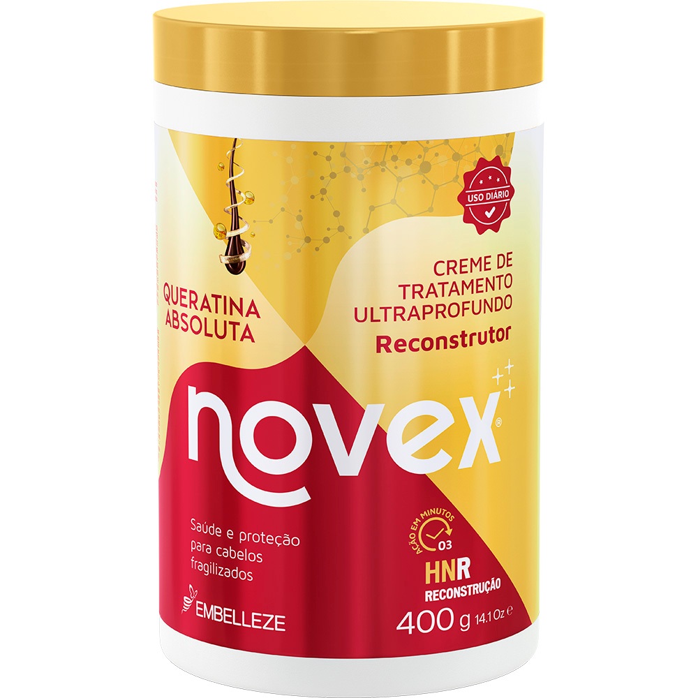 Esse KIT contém:1- Creme de Tratamento Novex Queratina Absoluta 400G1- Reconstrutor Novex Max Keratin Para todos os tipos de cabelos. AÇÃO Age penetrando profundamente e garantindo uma rápida absorção pelos fios, fortalecendo sua estrutura e revitalizando-os poderosamente. ATIVOS Queratina Brasileira Hidrolisada. BENEFÍCIOS Tratamento Reconstrutor Novex Recarga de Queratina Brasileira 80G Hiperativado, fórmula concentrada, resultado imediato, força, saúde e resistência. Reconstrutor Novex Max Keratin 250ML Fórmula concentrada. Resultado imediato. RESULTADO Cabelos fortes, resistentes e saudáveis. MODO DE USO Tratamento Reconstrutor Novex Recarga de Queratina Brasileira 80G Ritual para Cabelos Secos Com os cabelos úmidos, aplique o produto nos cabelos da raiz às pontas. Sem enxaguar, penteie de acordo com a sua preferência. Para um melhor resultado, finalize com prancha ou escova e aplique o reparador de pontas Nutrire Queratina Brasileira. Cabelos Oleosos: Com os cabelos úmidos, aplique nos cabelos da raiz às pontas, deixe agir por 15 minutos e enxágue. Você pode potencializar a ação do produto utilizando uma touca térmica. Após o seu passo a passo, enxágue os cabelos retirando o produto. Para um melhor resultado, finalize com prancha ou escova e aplique o reparador de pontas Nutrire Queratina Brasileira. Reconstrutor Novex Max Keratin 250ML Ritual: Após lavar os cabelos com o shampoo Vitay, com os fios ainda úmidos, coloque uma pequena quantidade de Novex Max Keratin. Deixe agir por 15 minutos. Enxágue abundantemente, condicione ou faça um tratamento mais completo de hidratação com o Novex Queratina Brasileira Creme de Tratamento Ultraprofundo 1 Kg. Frequência de Uso: 1º mês usar 1 vez na semana. No 2º mês usar a cada 15 dias. A partir do 3º mês, usar a cada 30 dias.