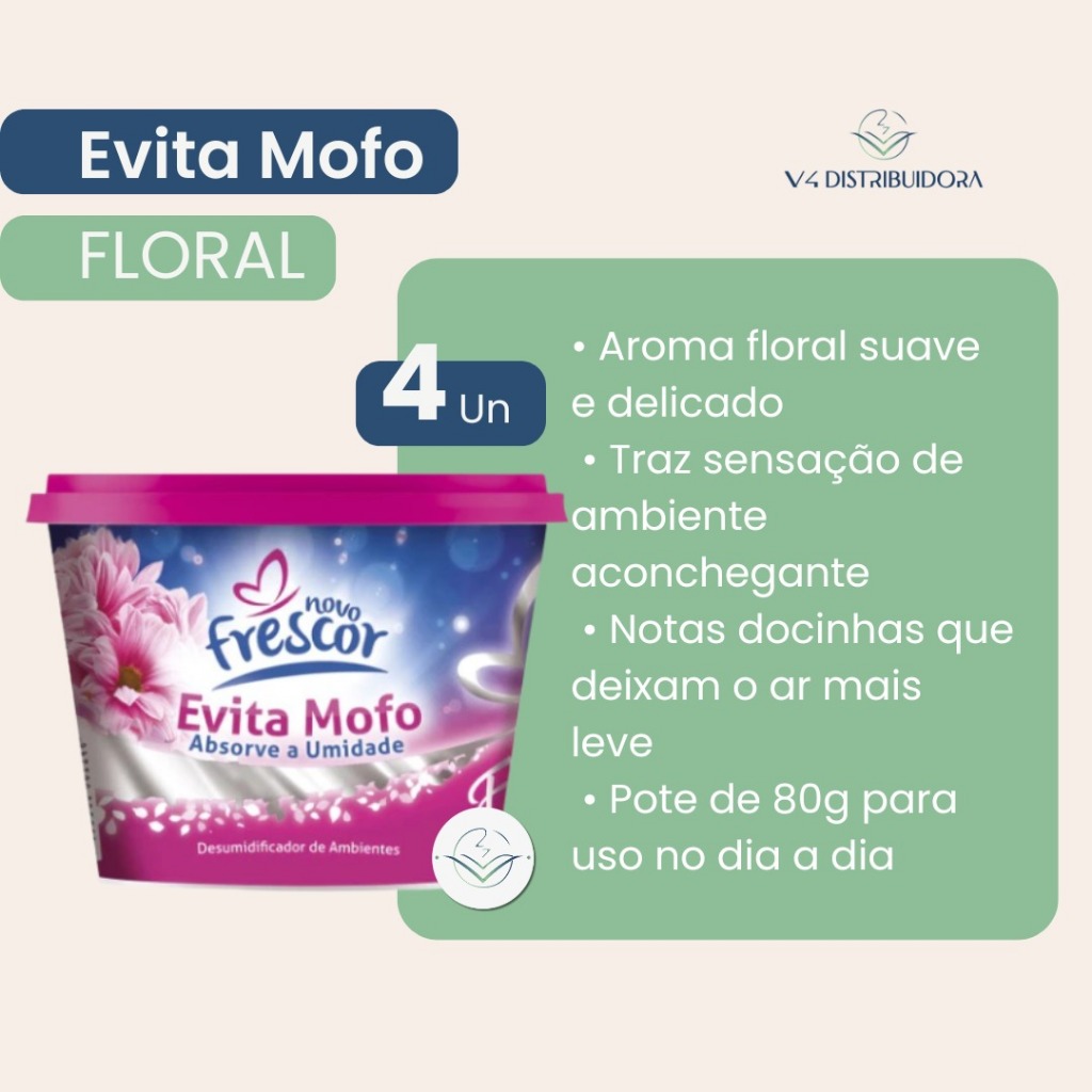Kit com 4 potes de 80g do Anti Mofo Novo Frescor. Ajuda a reduzir a umidade e minimizar odores em ambientes fechados. Fragrâncias disponíveis Kids: aroma suave e docinho, sensação de aconchego. Bambu: fresco e natural, toque cítrico. Floral: floral delicado, ambiente leve. Neutro: sem perfume, discreto. Obs.: Opção "Variado" será enviado conforme disponibilidade de estoque. Como funciona Absorve a umidade do ar e armazena a água dentro do pote. Ideal para armários, gavetas, closets e pequenos espaços. Modo de uso Limpe o local. Retire o lacre sem danificar o filtro. Utilize 1 pote por módulo de armário. Duração aproximada: 1 a 5 meses, conforme a umidade do ambiente. Substitua quando o nível de água atingir a marca indicada. Precauções • Mantenha fora do alcance de crianças e animais. • Evite contato direto com couros (pode ressecar). • Se o filtro rasgar ou houver vazamento, substitua o pote. • Não ingerir. Evite contato com olhos e pele. • Em caso de contato, lave com água abundante. • Em caso de ingestão, não provoque vômito e procure atendimento médico. • Não perfurar ou reutilizar a embalagem.