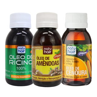 Kit Nutrição Profunda Natuhair – Óleo de Rícino + Óleo de Amêndoas + Óleo de Cenoura Óleo de rícino – nutre e fortalece os fios ; Óleo de amêndoas – emoliente, dá brilho e elasticidade ; Óleo de cenoura – aporta vitaminas A e E e beta‑caroteno para revitalizar e proteger . Benefícios do Kit – Nutrição Profunda Nutre e fortalece os fios, ajudando no crescimento saudável (Óleo de Rícino) Proporciona brilho e elasticidade, deixando o cabelo mais macio e maleável (Óleo de Amêndoas) Revitaliza e protege com vitaminas A, E e beta-caroteno (Óleo de Cenoura) Repõe vitaminas e ácidos graxos, essenciais para cabelos saudáveis Indicação: cabelos opacos ou ressecados que precisam de vitaminas e ácidos graxos.