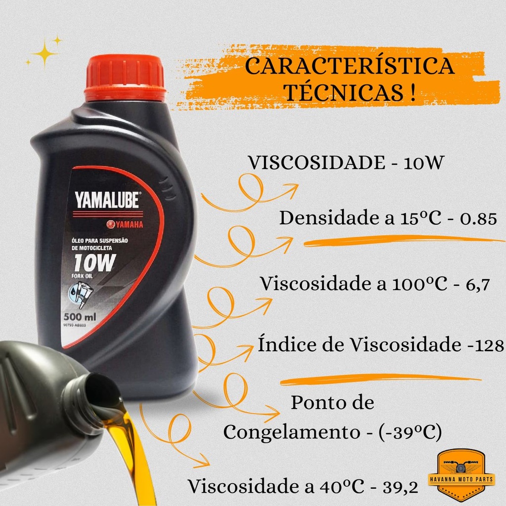 KIT ÓLEO DA BENGALA + RETENTORES Conteúdo da Embalagem: 01 Frasco de Óleo de Bengala Yamalube 500ml 02 Retentores da Bengala 02 Guarda Pó Código Original dos Retentores 4GU-F3145-00 / 2GSF314500 / 2GSF314400 Compativel com: YAMAHA FAZER 150 2014 FAZER 150 2015 FAZER 150 2016 FAZER 150 2017 FAZER 150 2018 FAZER 150 2019 FAZER 150 2020 FAZER 150 2021 FAZER 150 2022 FAZER 150 2023 FAZER 150 2024 YBR 150 FACTOR 2016 YBR 150 FACTOR 2017 YBR 150 FACTOR 2018 YBR 150 FACTOR 2019 YBR 150 FACTOR 2020 YBR 150 FACTOR 2021 YBR 150 FACTOR 2022 YBR 150 FACTOR 2023 YBR 150 FACTOR 2024 YBR 125 FACTOR 2009 YBR 125 FACTOR 2010 YBR 125 FACTOR 2011 YBR 125 FACTOR 2012 YBR 125 FACTOR 2013 YBR 125 FACTOR 2014 YBR 125 FACTOR 2015 YBR 125 FACTOR 2016 Características dos Retentores: - Produto desenvolvido com os mesmos parâmetros e encaixes do original, substituindo o mesmo sem nenhum problema ou adaptação. - Elaborado com matéria-prima de alta qualidade - Testado e aprovado dentro das normas de segurança. Benefícios do Óleo: - Desempenho garantido pela Yamaha Motor Co. Ltd.; - Yamalube Fork Oil 10W é constituído por bases minerais reforçadas por aditivos específicos, com um alto poder antidesgaste e boa fluidez a baixas temperaturas; - Possibilita um ótimo amortecimento em qualquer clima e estável ao longo do tempo; Especificações do Óleo: - Base mineral; - SAE 10W; - VISCOSIDADE - 10W - Densidade a 15ºC - 0.85 - Viscosidade a 40ºC - 39,2 - Viscosidade a 100ºC - 6,7 - Índice de Viscosidade - 128 - Ponto de Congelamento - (-39ºC) Importante !! - Antes de comprar, verifique o modelo compatível a sua moto. - Para a instalação do produto corretamente, leve ao mecânico de sua confiança! - Não nos responsabilizamos pelo mau uso do produto.