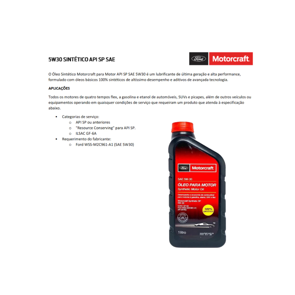 Kit troca de oleo Ford Motorcraft Original Aplicacoes do kit: COURIER 1997 1998 1999 2000 2001 2002 2003 2004 2005 2006 2007 2008 2009 2010 2011 2012 2013 KA 1997 1998 1999 2000 2001 2002 2003 2004 2005 2006 2007 2008 2009 2010 2011 2012 2013 2014 2015 2016 2017 FIESTA ROCAM 2002 2003 2004 2005 2006 2007 2008 2009 2010 2011 2012 2013 2014 ECOSPORT 2003 2004 2005 2006 2007 2008 2009 2010 2011 2012 2013 2012 2013 2014 2015 2016 2017 FOCUS 2000 2001 2002 2003 2004 2005 2006 2007 2008 2009 2010 2011 2012 2013 2014 2015 2016 2017 FUSION 2009 2010 2011 2012 (motores 2.5 e v6) NOVO FUSION 2013 2014 2015 2016 2017 (A PARTIR DO MY2018 SOMENTE 2.0L ECOBOOST) NEW FIESTA 2010 2011 2012 2013 2014 2015 2016 2017 Conteudo: 4 litros de oleo 5W30 - BXO5W30GA - WSS M2C961-A1 API SPRC 1 filtro de oleo - BJ3A6714AA 1 etiqueta Motorcraft para marcacao de troca do oleo FAVOR FORNECER O CHASSI DO VEICULO PARA CONFIRMAR A APLICACAO DAS PECAS! Marca: Produtos originais Ford (MOTORCRAFT)