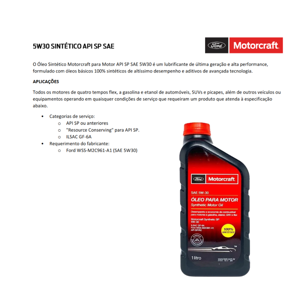 Descricao do produto: Aplicacao: Descricao do produto: Kit troca de oleo Ford Motorcraft Original Aplicacoes do kit: COURIER 1997 1998 1999 2000 2001 2002 2003 2004 2005 2006 2007 2008 2009 2010 2011 2012 2013 KA 1997 1998 1999 2000 2001 2002 2003 2004 2005 2006 2007 2008 2009 2010 2011 2012 2013 2014 2015 2016 2017 FIESTA ROCAM 2002 2003 2004 2005 2006 2007 2008 2009 2010 2011 2012 2013 2014 ECOSPORT 2003 2004 2005 2006 2007 2008 2009 2010 2011 2012 2013 2012 2013 2014 2015 2016 2017 FOCUS 2000 2001 2002 2003 2004 2005 2006 2007 2008 2009 2010 2011 2012 2013 2014 2015 2016 2017 FUSION 2009 2010 2011 2012 (motores 2.5 e v6) NOVO FUSION 2013 2014 2015 2016 2017 (A PARTIR DO MY2018 SOMENTE 2.0L ECOBOOST) NEW FIESTA 2010 2011 2012 2013 2014 2015 2016 2017 Conteudo: 4 litros de oleo 5W30 - BXO5W30GA - WSS M2C961-A1 API SPRC 1 filtro de oleo - BJ3A6714AA 1 etiqueta Motorcraft para marcacao de troca do oleo FAVOR FORNECER O CHASSI DO VEICULO PARA CONFIRMAR A APLICACAO DAS PECAS! Marca: Aplicacao universal ou nao informada, se tiver duvida, nos faca uma pergunta.