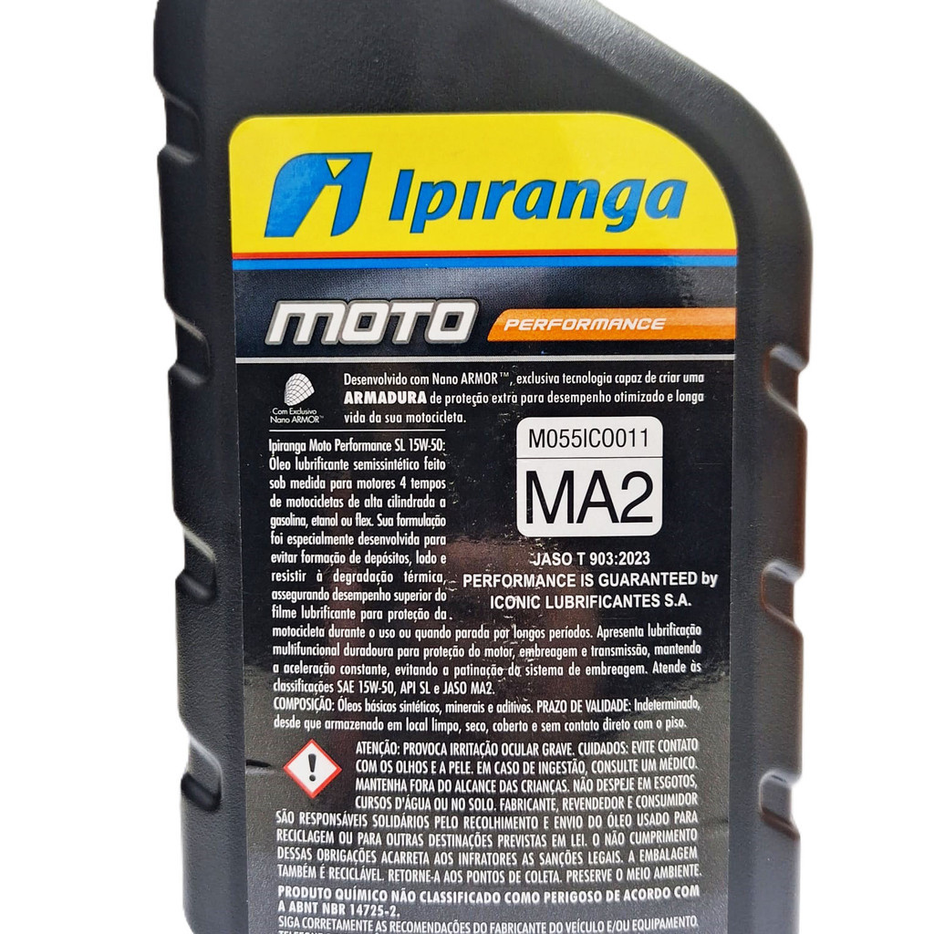 Ipiranga Moto Performance SL 15W-50 Óleo lubrificante semissintético feito sob medida para motores 4 tempos de motocicletas de alta cilindrada a gasolina, etanol e flex. Sua formulação foi especialmente desenvolvida para evitar formação de depósitos, e resistir a degradação térmica, assegurando desempenho superior do filme lubrificante para a proteção da motocicleta, durante o uso ou parada por longos períodos. Desenvolvido com Nano ARMOR™, exclusiva tecnologia capaz de criar uma ARMADURA de proteção extra para desempenho otimizado e longa vida do seu motor. Conteúdo da Embalagem: 04 Litros de Óleo Ipiranga 15w50 Moto Performance (semissintético) Especificações: - Aplicação: Lubrificantes para Motor - Qualidade: Semissintético - Tipo de motor: 4 Tempos - Viscosidade: 15w50 - Atende ou excede: SAE 15w50, API SL e JASO MA2.. (as mais exigentes classificações mundiais para motores a gasolina.) - Número de Registro ANP: 16711 Apresenta lubrificação multifuncional duradoura para proteção do motor, embreagem e transmissão, mantendo a aceleração constante, evitando a patinação do sistema de embreagem. Atende às classificações SAE 15W50, API SL e JASO MA2. Importante: - Recomendamos que a troca seja feita por um profissional de sua confiança! - Ao descartar o produto, tenha o devido cuidado com o meio ambiente. - Em caso de dúvidas, entre em contato através dos nossos canais de atendimento.