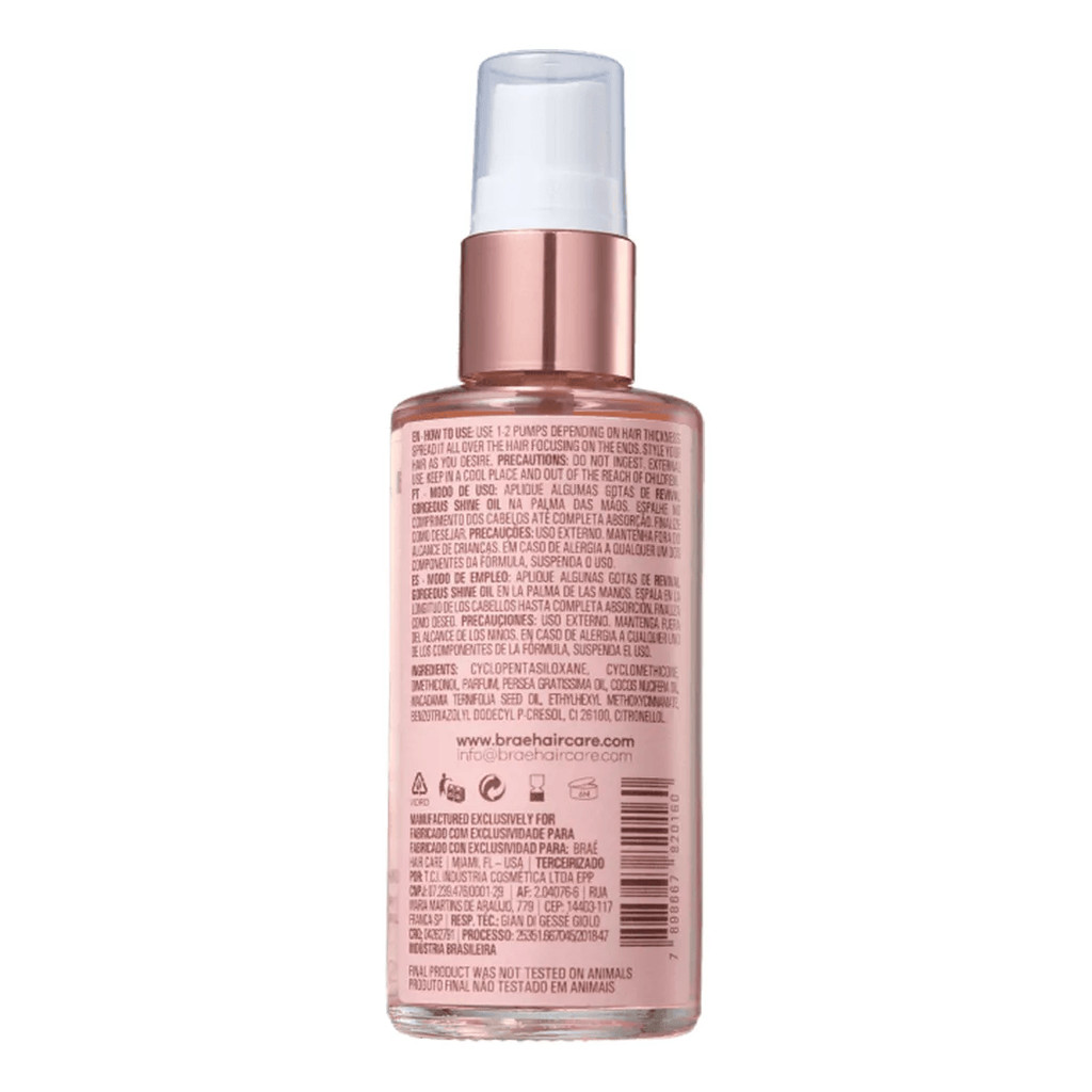 Você está comprando em uma loja Autorizada BRAÉ Essential Oil Blend 60ml- Braé Descrição do Produto: O Essential Oil Blend é o segredo para cabelos perfeitamente nutridos e protegidos. Sua fórmula exclusiva combina ácido hialurônico com um poderoso blend de óleos vegetais, proporcionando uma reparação profunda dos fios danificados, hidratação prolongada e proteção contra as agressões térmicas e diárias. Com o Essential Oil Blend, seus cabelos terão uma aparência saudável, brilhante e cheia de vida. Ativos Principais: O Vitaoils Repair é um complexo de óleos, que junto ao ácido hialurônico, compõe o coração do Essential Oil Blend Essa poderosa combinação de óleos de abacate, rosa mosqueta, girassol e macadâmia oferece uma ação intensa de nutrição e reparação capilar. Além disso, esse complexo forma uma película protetora ao redor dos fios, evitando a perda de umidade e mantendo os cabelos hidratados por mais tempo. O ácido hialurônico completa essa riquíssima fórmula, promovendo hidratação profunda e reparando as pontas duplas. Prepare-se para experimentar cabelos macios e cheios de vitalidade. Conselus de Uso: A aplicação do Essential Oil Blend é simples e eficaz. Basta colocar algumas gotas do produto na palma das mãos e espalhá-lo ao longo do comprimento dos cabelos, até que seja completamente absorvido. Você pode finalizar como desejar, seja deixando-os soltos, criando um penteado elegante ou utilizando alguma ferramenta de calor. Aproveite os benefícios de um tratamento completo, repleto de nutrição, reparação e proteção, tudo em um único produto. Revival BRAÉ Gorgeous Shine Oil - 60ml Sobre o produto: Revival Gorgeous Shine Oil, é um óleo capilar que possui ação repositora lipídica, elaborado com óleos de coco, abacate e macadâmia, hidrata, nutre, sela e fortalece as pontas ressecadas, promovendo brilho intenso, maciez e vitalidade aos fios. O uso regular do produto previne a formação de pontas duplas. Além de finalizador, Revival Gorgeous Shine Oil pode ser usado como complemento em máscaras de reparação. Não possui proteção contra fonte de calor. Ação ÓLEO DE COCO, ABACATE E MACADÂMIA: impede a perda natural da água dos fios e restaura a saúde, maciez e brilho. Modo de usar: Aplique algumas gotas do óleo na palma das mãos. Espalhe no comprimento dos cabelos até completar a absorção. Finalize como desejar. Pode ser usado como finalizador ou como complemento da mascara capilar. Resultado Cabelo nutrido, macio e com um brilho intenso. Cuidados/Restrições Este produto não deve ser utilizado como protetor térmico. Evite o contato com os olhos. Caso isso aconteça, enxágue com água em abundância. Havendo irritação, suspender o uso e procurar orientação médica. Não ingerir. Manter fora do alcance de crianças. Uso externo.