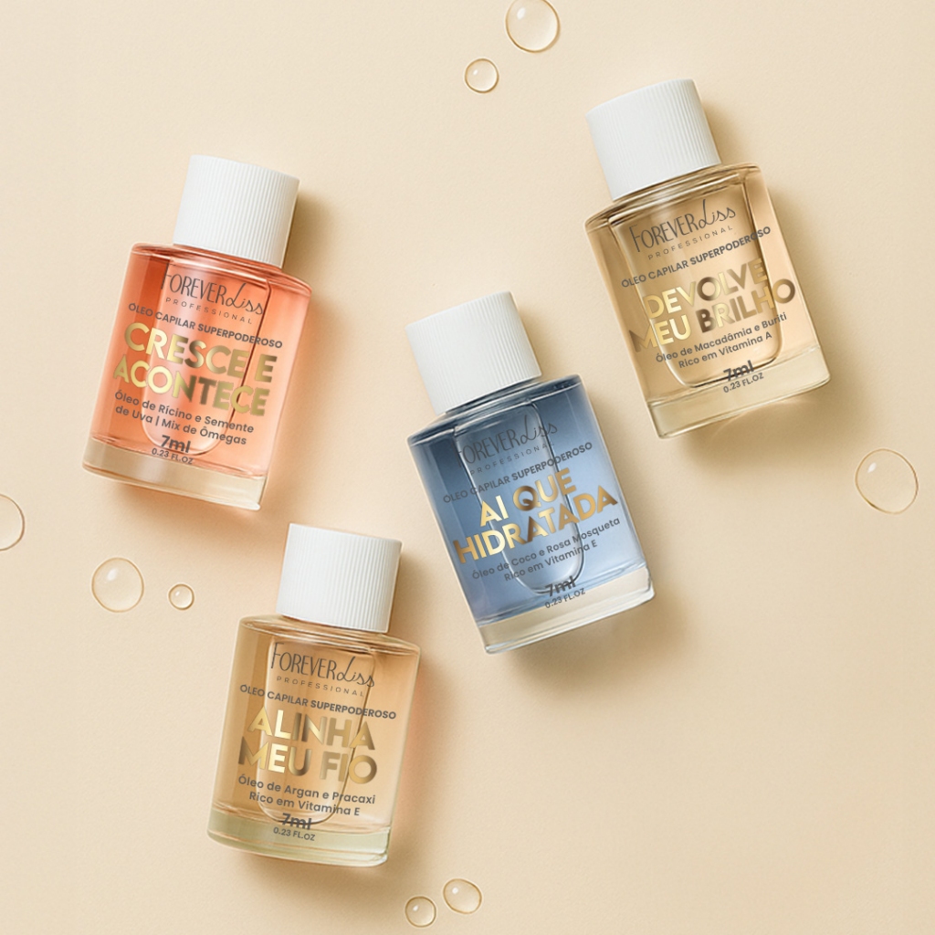 O Kit Óleos Capilares Superpoderosos completo Forever Liss 7 ml é o melhor parceiro para a mulher que assume o papel de heroína da rotina. Perfeitos para o dia a dia, eles são ultraleves, versáteis e possuem fragrâncias especiais que podem ser combinadas para criar um perfume exclusivo. Cada óleo foi desenvolvido unindo ativos consagrados no skincare, como as vitaminas A e E, ao que há de mais moderno na tecnologia capilar. Essa união resulta na solução imediata do ressecamento e opacidade dos fios. Indicação O Kit Óleos Superpoderosos completo Forever Liss 7 ml é perfeito para todos os tipos de cabelos, especialmente aqueles que estão ressecados, sem brilho, fragilizados e com frizz. Modo de uso Basta aplicar de 2 a 3 gotas de qualquer um dos Óleos Superpoderosos nas mãos e espalhar pelo comprimento dos fios secos ou úmidos, evitando a raiz. Não é necessário enxaguar. Também é possível misturar algumas gotas da versão escolhida na sua máscara de tratamento favorita. Outra forma de uso é como pré-shampoo, antes da lavagem. Você ainda pode misturar fragrâncias e criar combinações exclusivas. Contém 01 - Óleo Capilar Superpoderoso Ai que Hidratada Forever Liss 7 ml 01 - Óleo Capilar Superpoderoso Alinha Meu Fio Forever Liss 7 ml 01 - Óleo Capilar Superpoderoso Cresce e Acontece Forever Liss 7 ml 01 - Óleo Capilar Superpoderoso Devolve Meu Brilho Forever Liss 7 ml Precauções Mantenha em local fresco, arejado e ao abrigo de luz. Manter fora do alcance de crianças e animais. Não ingerir. Uso externo. Em caso de contato com os olhos, enxágue imediatamente com água em abundância. Havendo irritação, suspenda o uso e procure orientação médica. Principais Dúvidas: 01. Qual a frequência de uso dos Óleos Superpoderosos Forever Liss 7 ml? Todos os óleos da linha podem ser usados diariamente. 02. Como posso utilizar os Óleos Superpoderosos Forever Liss 7 ml? Aplique algumas gotas diretamente nos fios secos ou úmidos. Também pode misturar à sua máscara favorita ou usar como pré-shampoo. 03. Deixa o cabelo pesado? Não! As fórmulas foram desenvolvidas para serem ultraleves e de absorção imediata. 04. Posso combinar diferentes Óleos Superpoderosos Forever Liss 7 ml? Sim! Você pode misturar suas versões favoritas e criar fragrâncias exclusivas. 05. A fragrância permanece nos fios? Sim, cada óleo tem fragrância inspirada em perfumaria fina que permanece por muito mais tempo.