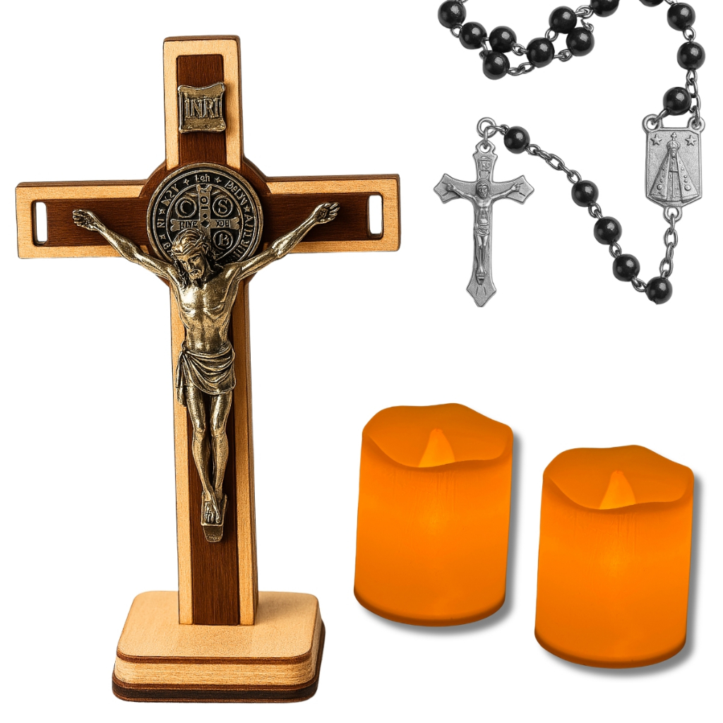 Kit Oratório Quaresma Cruz de Madeira 18cm Vela Led Bateria Terço Hematita