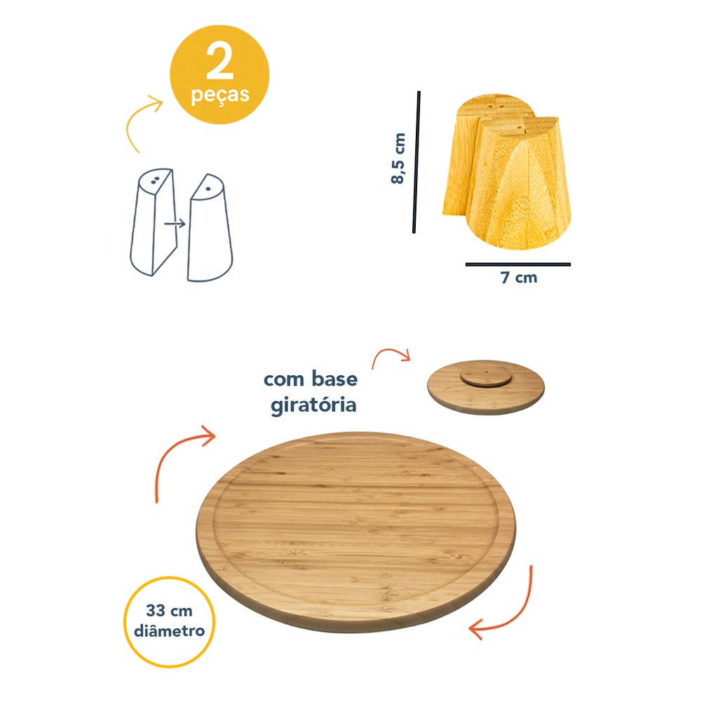 Este é o kit organizador de bancada com utensílios de bambu e 2 potes de 200ml de mantimentos empilhável com tampa de bambu. Esse é o porta papel toalha de bambu da OIKOS. Em bambu: material leve, resistente e ecologicamente correto. Resistente e prático: ele pode ser colocado sobre a bancada da cozinha, aproveitando melhor o espaço do móvel e deixando o papel toalha pronto pra uso e sempre ao seu alcance. Versátil: pra servir ou decorar. em um instante vai do fogão a bancada e em seguida você pode colocá-lo direto a mesa para deixar seus convidados a vontade. Esse é o kit de utensílios de bambu 4pçs da MOZCADA. Prático: são 4 peças pra te ajudar no dia a dia, na hora de cozinhar ou servir. Durável e higiênico: o bambu é um material resistente e com propriedades que evitam a proliferação de bactérias. Decorativo: o bambu natural traz beleza e personalidade pra sua casa. Esse é o conjunto de saleiro e pimenteiro cônico da OIKOS. Peça dupla: parece um só, mas são dois bem juntinhos, um com um buraco de saída duplo para o sal, o outro com saída única para a pimenta. Design decorativo: por ter um estilo diferente dos saleiros e pimenteiros, ele pode ser confundido como peça decorativa - e também pode ser, né? Durável e higiênico: o bambu é um material resistente e com propriedades que evitam a proliferação de bactérias. Prático: dois produtos em (quase) um só. Encaixa perfeitamente e ocupa menos espaço na mesa. Esses são os potes de mantimentos empilhável com tampa de bambu da OIKOS. Empilhável: a tampa possibilita encaixar a base de um pote na tampa de outro - aquela ajudinha extra para aproveitar bem todo espaço que tem. Versátil: além de condimentos, nele também cabe purpurina, algodão, conchas, moedas, peças de jogos, itens de escritório e outras miudezas que você quiser guardar - isso que é versatilidade! Design decorativo: funcional e bonito, esse potinho transita muito bem entre os ambientes e dá um toque decorativo por onde quer que vá - quarto, banheiro, cozinha, sala, escritório ou lavanderia, você que manda. Veda de verdade: além de ter uma beleza natural da combinação vidro e bambu, esse pote tem em sua tampa um anel de silicone que garante uma vedação total - conservando os alimentos por muito mais tempo. Higiênico e durável: o corpo é de vidro borossilicato bem resistente e a tampa é de bambu, um material que evita a proliferação de bactérias. Essa é a tábua giratória de bambu da OIKOS. Multiuso: pode ser usada para apoiar travessas na mesa, organizar bijus no quarto ou até fazer parte de algum jogo em roda. Base giratória: a tábua não sai do lugar, mas gira para trazer para mais pertinho o que ficou do outro lado. Prática: "me passa o sal?" se usar para acessórios de mesa, é só girar a tábua para conseguir passar - ou se usar para petisco, só girar para pegar aquele último pedacinho de queijo mesmo. Design decorativo: o bambu natural dá um toque a mais na decoração. Durável e higiênico: o bambu é um material resistente e com propriedades que evitam a proliferação de bactérias. Fácil de lavar: basta higienizar com detergente neutro e guardar quando estiver bem seca. Esse Kit contém: 1 Unidade PORTA PAPEL TOALHA DE BAMBU Largura: 16cm / Altura: 33cm 1 Unidade KIT DE UTENSÍLIOS DE BAMBU 4PCS – MOZCADA Largura: 8,5Cm / Altura: 31cm 1 Unidade SALEIRO E PIMENTEIRO DE BAMBU – OIKOS Largura: 7cm / Altura: 8,5cm 1 Unidade TABUA DE BAMBU COM BASE GIRATÓRIA – OIKOS Diâmetro: 33cm 2 Unidades POTE DE MANTIMENTOS EMPILHÁVEL COM TAMPA DE BAMBU 200ML – OIKOS Largura: 6,8cm / Altura: 8cm
