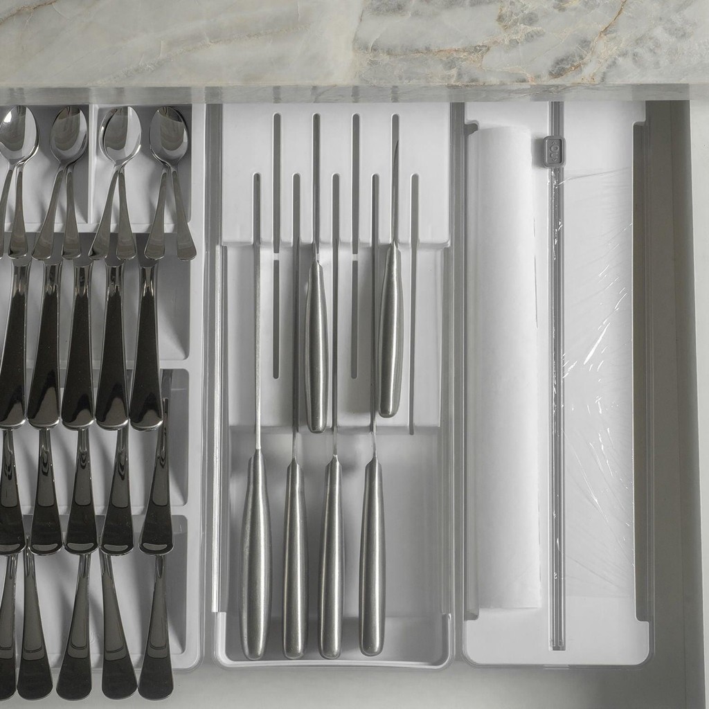 Este kit é perfeito para organizar e otimizar o espaço das suas gavetas. O primeiro item, Cortador e Organizador de rolos, foi pensado para armazenar rolos de plástico filme, papel alumínio e papel manteiga e acomoda dois rolos de 15 a 30 metros e até 30 cm de comprimento, garantindo que tudo fique no lugar. Proporciona mais praticidade para a rotina na cozinha pois mantêm os rolos sempre prontos para uso, com um corte perfeito a cada utilização. As ventosas na base estabilizam o organizador, seja dentro da gaveta ou sobre a bancada. Para trocar os rolos basta abrir a tampa com os botões laterais, inserir os rolos e fechar. O segundo item, comporta 9 facas sendo 5 facas grandes e 4 facas pequenas. Além de divisórias que preservam o fio das facas, proporciona segurança para você e sua família, sem o risco de alguém se machucar procurando pela faca ideal na gaveta. O terceiro item completa uma perfeita combinação para a gaveta, pois traz 5 opções para organização dos talheres. Combine, encaixe, visualize e acesse facilmente o conteúdo, mantendo tudo em ordem. Produzido em material resistente e de alta transparência, esses organizadores são práticos e fáceis para higienizar. A linha Clear é indispensável para auxiliar você na organização da sua casa. INFORMAÇÕES TÉCNICAS Dimensões: LxAxP: 15x6x38 cm. Material: PS (Poliestireno) Cor: Branco CUIDADOS Sugere-se higienizar com sabão neutro e esponja macia, evitando produtos abrasivos no processo de limpeza. Não é recomendado colocar o material na lava-louças. CONTEÚDO DA EMBALAGEM 1 Organizador de Facas Clear 37,5 x 15 x 5,6 cm 1 Organizador de talheres Clear 37,5 x 15 x 5,6 cm 1 Organizador e cortador de rolos duplo Ou Clear Gavetas SOBRE NÓS Somos apaixonados pelo que fazemos e utilizamos o design como meio de fazer você se sentir em casa onde estiver. Criamos produtos com carinho e cuidado para atender as suas necessidades diárias, levando bem-estar, aconchego e conforto para seu lar. Somos minimalistas e funcionais pois queremos que você tenha um estilo de vida mais leve e organizado, para atingir o máximo do seu potencial. Prazer, somos Ou.
