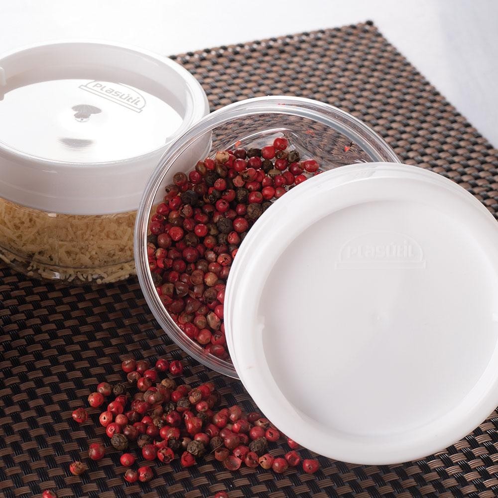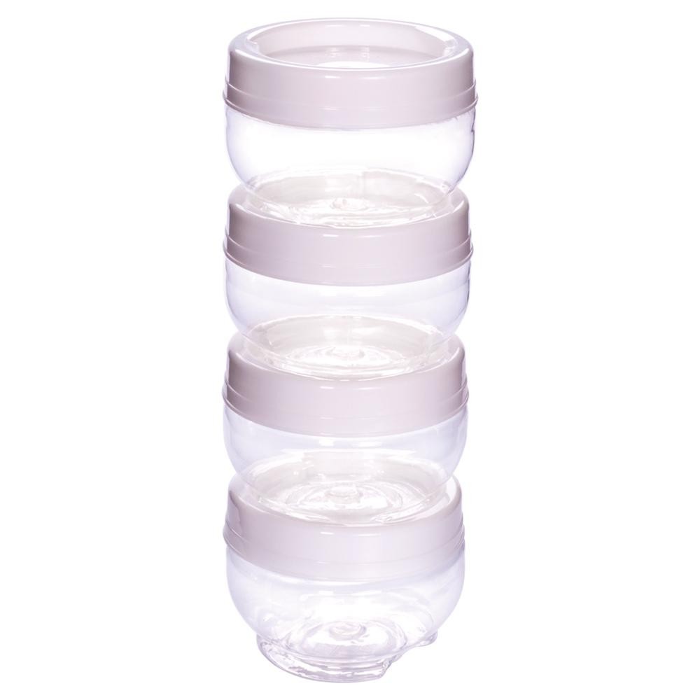 Kit Organizadores Gire e Trave 4 Peças Dimensao: (Diâmetro x Alt): 7,9x20,3 cm Capacidade: 155 ml (cada). Tampa fabricada em polipropileno (PP) e corpo fabricado em PET. Ambos atóxicos e livres de bisfenol-A (BPA FREE). Conjunto de organizadores de plástico com tampa rosca que se encaixam e travam. Modulares empilháveis. Não esterelizar com água quente. Não usar no micro-ondas. Não usar na lava-louças. Não armazenar alimentos quentes. Temperatura máxima permitida: 50°C. Não deixar exposto ao sol. Lavar com esponja macia. Pode ser levado ao freezer. Não pode ser esterelizado com água quente..
