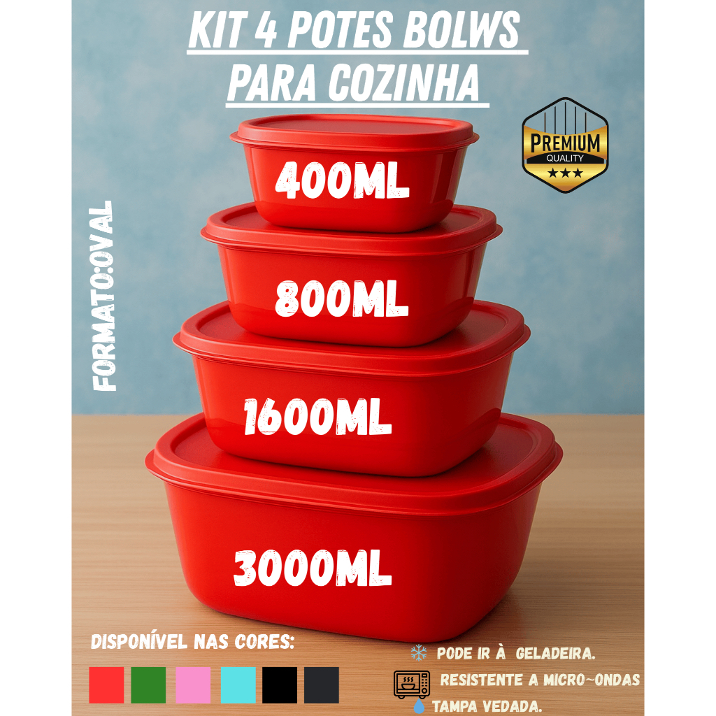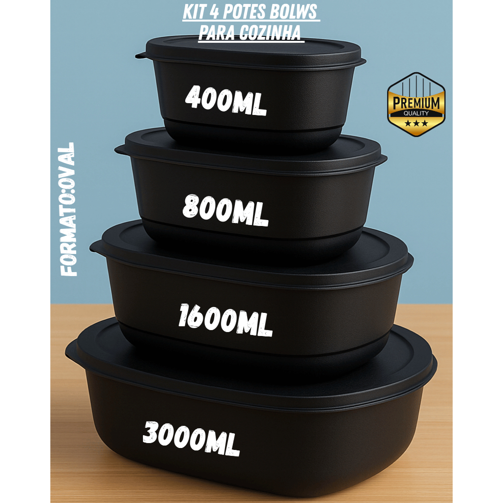 Kit Oval 4 Potes Plásticos com Tampa Multiuso- Armazenamento de alimentos e Marmitas
