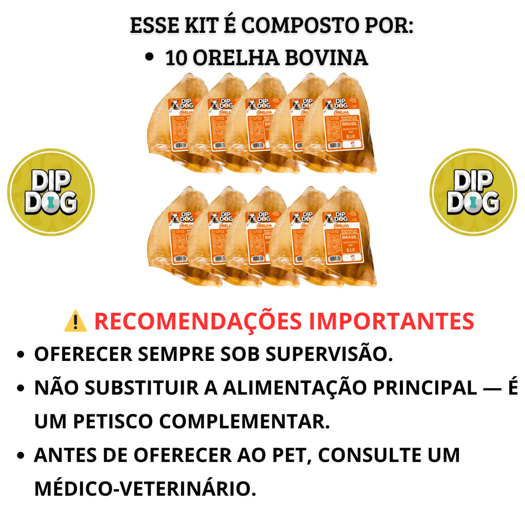 Kit Pacote Com 10 Petisco Natural Orelha Bovina Desidratada Para Cachorro Dip Dog