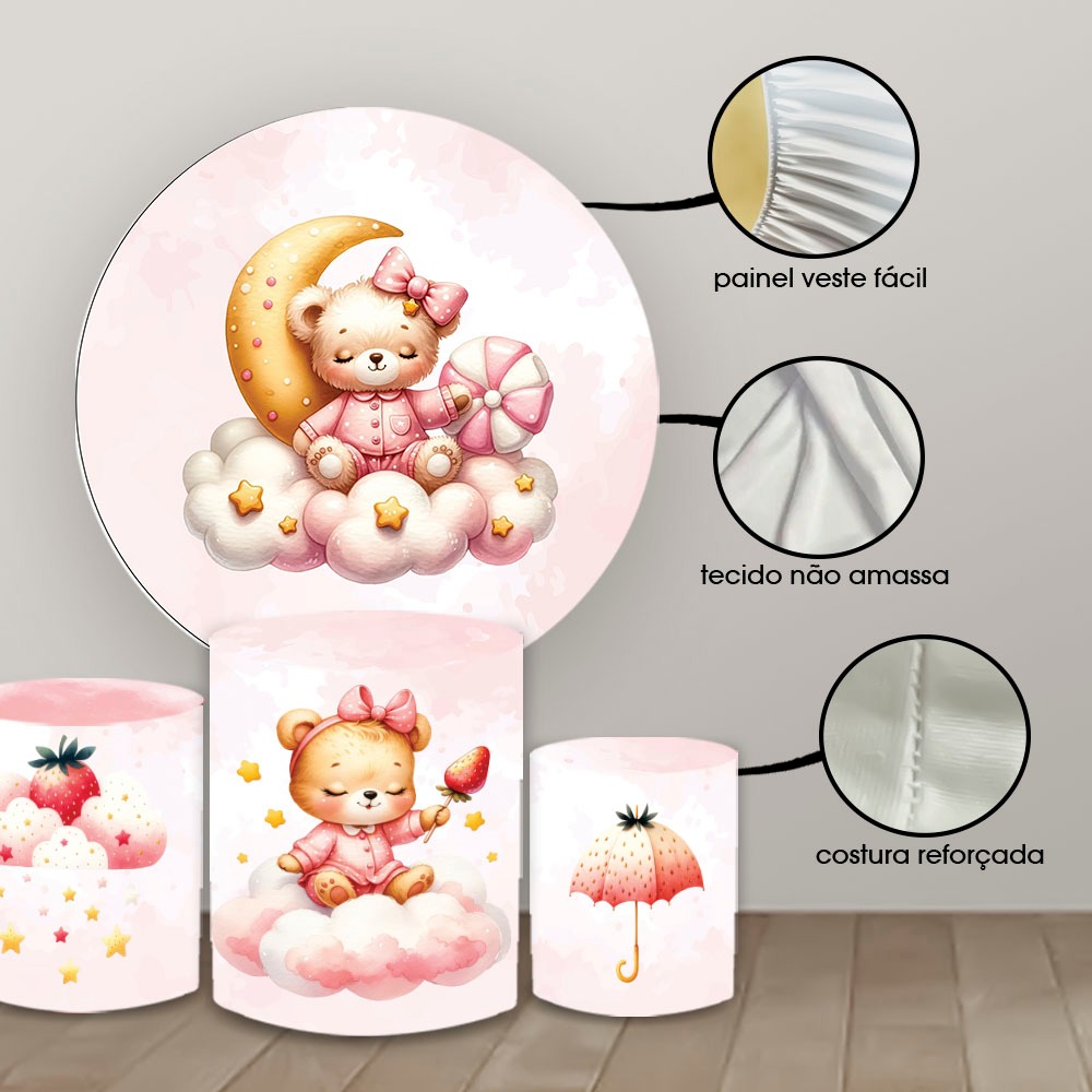 Kit Painel 1,50x1,50 Sublimado+Trio De cilindros vest facil Tema Ursinho rosa lua Aniversario