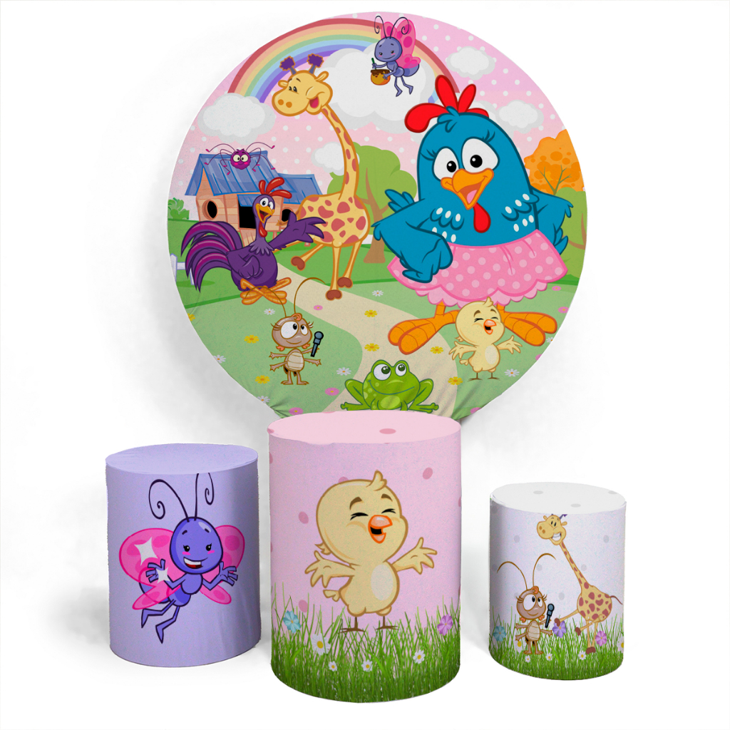 Kit Painel Capa Decoração Redondo E Capa Conjunto Cilíndro Festa Infantil Galinha Pintadinha