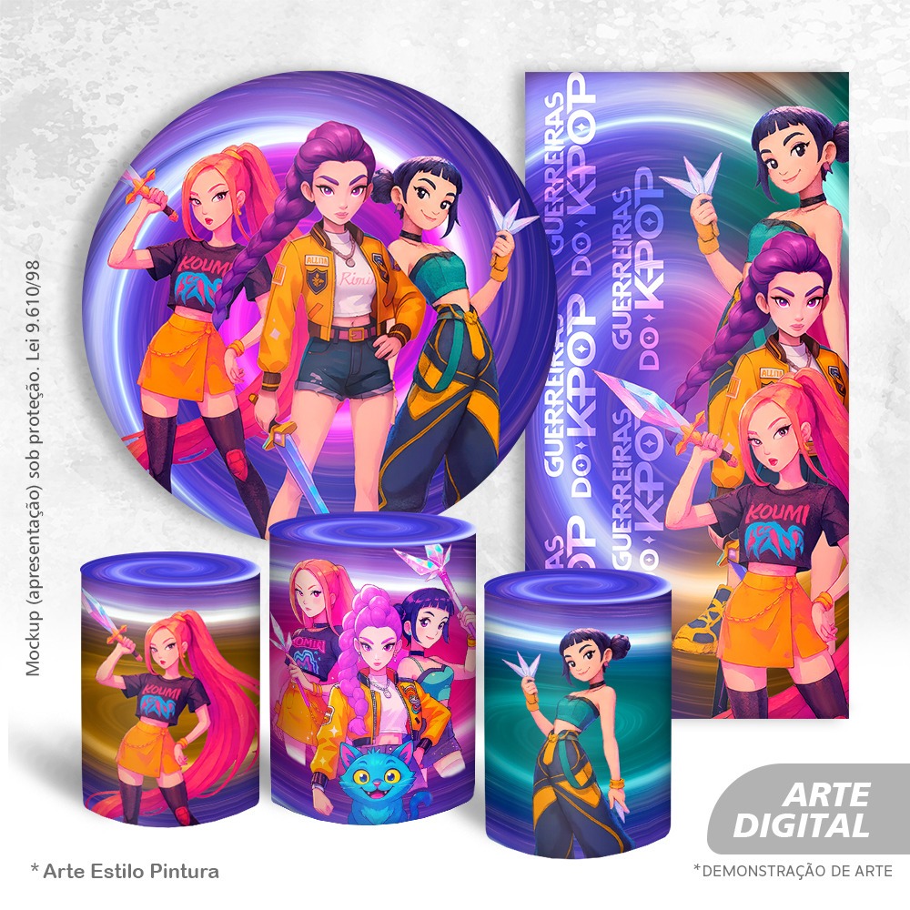 KIT PAINEL DE FESTA GUERREIRAS KPOP ANIME, REDONDO 1,5M DE DIÂMETRO + 3 CAPAS CILINDROS + VERTICAL 2X1
