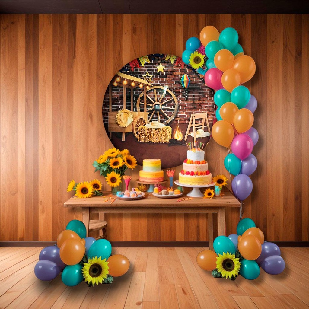 KIT Painel Festa Junina Redondo 3D Sublimado Com Elástico 1,5 metros + Suporte Bambolê Marrom