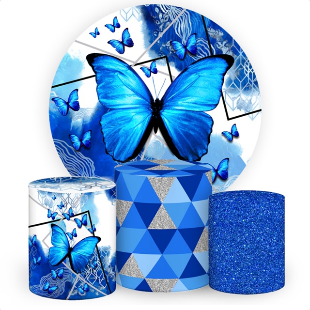 Kit Painel Redondo de Festa + Trio Capas de Cilindro Veste Fácil Tecido Borboletas Azul SKP-213