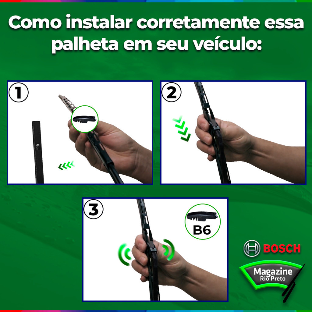 Par de palhetas para o limpador de para-brisa dianteiro Volkswagen Voyage G1 1981 Até 1995 - Original Bosch Par de Palheta Eco Bosch 01 - Palheta Eco Bosch (lado motorista) 16 '' 01 - Palheta Eco Bosch (lado passageiro) 16 " APLICAÇÃO: - Vw Voyage G1 1981 - Vw Voyage G1 1982 - Vw Voyage G1 1983 - Vw Voyage G1 1984 - Vw Voyage G1 1985 - Vw Voyage G1 1986 - Vw Voyage G1 1987 - Vw Voyage G1 1988 - Vw Voyage G1 1989 - Vw Voyage G1 1990 - Vw Voyage G1 1991 - Vw Voyage G1 1992 - Vw Voyage G1 1993 - Vw Voyage G1 1994 - Vw Voyage G1 1995 ENCAIXE: BAIONETA (B6) ** PRODUTO A PRONTA ENTREGA ** OBS: As informações contidas no verso da embalagem são apenas sugestões de uso porém o produto é compatível com o veículo de ano e modelo anunciado acima. *Em caso de dúvidas para a instalação, consulte o vídeo disponibilizado no anúncio do produto ou entre em contato conosco para que possamos disponibilizar o material explicativo de como seguir com a aplicação em seu veículo. Substitua as palhetas do seu veículo pelo menos uma vez por ano. Se a palheta for nova e o defeito persistir, verifique também a regulagem dos braços do limpador de para-brisa. Bosch é o único fabricante de palhetas que desenvolveu um processo inovador de revestimento da borracha, o Power Protection Plus, um tratamento interno da borracha, que garante funcionamento suave, perfeita ação de limpeza e maior vida útil. As demais palhetas existentes no mercado possuem tratamento superficial da borracha, o que acaba prejudicando sua durabilidade e eficácia com o uso contínuo. As palhetas do limpador de para-brisas da Bosch são compostas por componentes com qualidade certificada, o que assegura uma limpeza ideal. Características: - Nova geração de palheta Bosch aerodinâmica, substitui a palheta convencional nos veículos. - Desenho aerodinâmico – mantém a pressão uniforme em todo o para-brisa. - Longa vida útil, sem partes metálicas expostas, mantendo a funcionalidade e estética visual do produto. - Tratamento de grafite, garantia de uma limpeza mais suave. - Funcionamento suave. - Perfeita ação de limpeza. - Maior vida útil. - A melhor visibilidade e o enorme nível. - Alta qualidade e tecnologia de ponta. As palhetas perdem propriedades de limpeza pela constante exposição às mudanças de temperatura, sol, chuva, além de substâncias corrosivas do ambiente. Por isso precisam ser substituídas regularmente, para garantir boa visibilidade e segurança ao motorista. Substitua as palhetas ao observar: - Problemas no para-brisa: - Formação de faixas e riscos - Ruído ou trepidação - Formação de névoa - Falhas na limpeza - Problemas nas palhetas: - Lâmina quebradiça - Lâmina torta - Lâmina rompida