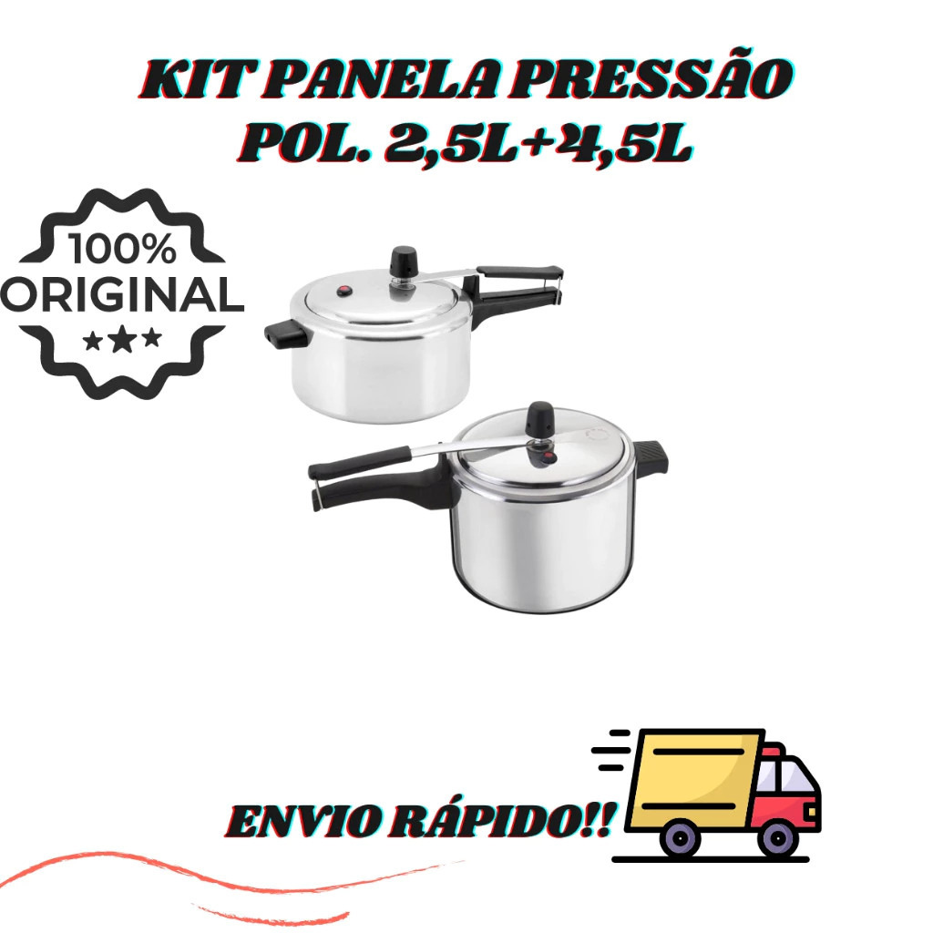 KITS COM 2 PANELAS DE PRESSÃO, PERSONALIZE SUA COZINHA. - 2,5 + 4,5 LITROS O kit é composto por uma panela de 2,5 litros , ideal para cozinhar pequenas quantidade de alimento de forma rápida, acompanhada de outra panela 4,5 litros . Especificações Técnicas: -Marca: ASJ -Certificação: INMETRO - Capacidade volumétrica: 2,5L / 4,5L - Pressão de trabalho: 70 kPa - Material: Liga de Alumínio certificada, com espessura de 2,3 mm - Acessórios: Baquelite - Guarnição (anel de vedação) e válvula de segurança em silicone - Acabamento: Polido - Produto de alta qualidade Utilização do Produto: - Ideal para cozimento de alimentos a pressão Cuidados e Conservação: - Remova a etiqueta e lave antes do primeiro uso - Evite deixar alimentos como sal, alho e molho de tomate por muito tempo em contato com o utensílio para prevenir manchas e corrosão - Limpeza e substituição dos acessórios devem ser feitas conforme necessário, utilizando acessórios originais Segurança no Uso: - Não ultrapasse 2/3 do dimensionamento da panela com água e alimentos para evitar problemas na válvula reguladora de pressão e de segurança - Mantenha os cabos voltados para dentro do fogão e evite que a chama ultrapasse a base da peça - Utilize luvas térmicas para manusear utensílios quentes - Recomenda-se o reaperto dos parafusos periodicamente - Produto para uso doméstico em fogão a gás - Leia atentamente o manual de instruções fornecido com o produto!