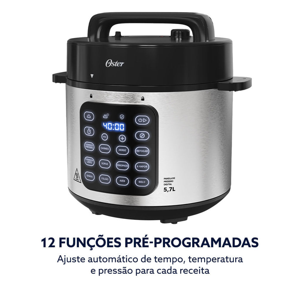 Esse kit contém os seguintes itens: Panela de Pressão Elétrica Digital 5,7L Oster - OPAN930 A Panela Elétrica de Pressão Digital Multifuncional Oster® é a panela de pressão elétrica com o maior número de sistemas de segurança do mercado brasileiro. Com 18 dispositivos de segurança, 12 funções pré-programadas e 5,7 L de capacidade, ela foi desenvolvida para famílias que valorizam refeições saudáveis e momentos de qualidade compartilhados. Tecnologia avançada que se encaixa na rotina, oferecendo funcionalidade e tranquilidade no preparo do dia a dia. - 16 travas de proteção + 2 válvulas de segurança Sistema integrado que monitora e protege em múltiplas camadas: controle de pressão, detecção de temperatura, bloqueio inteligente da tampa e válvulas de alívio automático. - Acabamento antiaderente: Facilita tanto o preparo quanto a limpeza, tornando a manutenção rápida e prática. - 12 funções pré-programadas: Arroz, feijão, sopas, carnes ensopadas, legumes no vapor e muito mais. A panela ajusta automaticamente tempo, temperatura e pressão para cada preparo. - 5,7 L de capacidade: Espaço ideal para preparar refeições completas para toda a família sem precisar repetir preparos. - Painel digital touch: Design moderno e intuitivo que facilita a operação e mantém a bancada clean e sofisticada. - 1000 W de potência: Preparo eficiente com cozimento uniforme, mantendo nutrientes e o sabor autêntico de cada receita. - Acessórios inclusos: Acompanha dosador de medida e colher para maior precisão e praticidade no dia a dia. Dimensões [LxAxP]: 160x245x235mm Garantia (meses): 12 meses Selo de Segurnça: OCP SGS Panela Elétrica de Arroz DiamondTech 1,2L Oster Black - CKSTRCB7DFBLK Tecnologia exclusiva DiamondTech Possui antiaderência que evita riscos e que os alimentos grudem. - Tampa de vidro refratário: Transparente e com ventilação que evita o cozimento excessivo. - 500W de potência: Garante mais agilidade no cozimento. - Sinalizador luminoso: Permite visualizar todas as funções durante o preparo. - Função manter aquecido: Mantém os preparos na temperatura ideal para servir. - Recipiente removível de 1,2 L: Capacidade para até 7 xícaras de arroz e cabo também removível. - Acessórios inclusos: copo medidor e colher: Acompanha acessórios úteis durante o uso. Dimensões [LxAxP]: 315 x 255 x 230 mm Garantia (meses): 12 Selo de Segurança: OCP UL