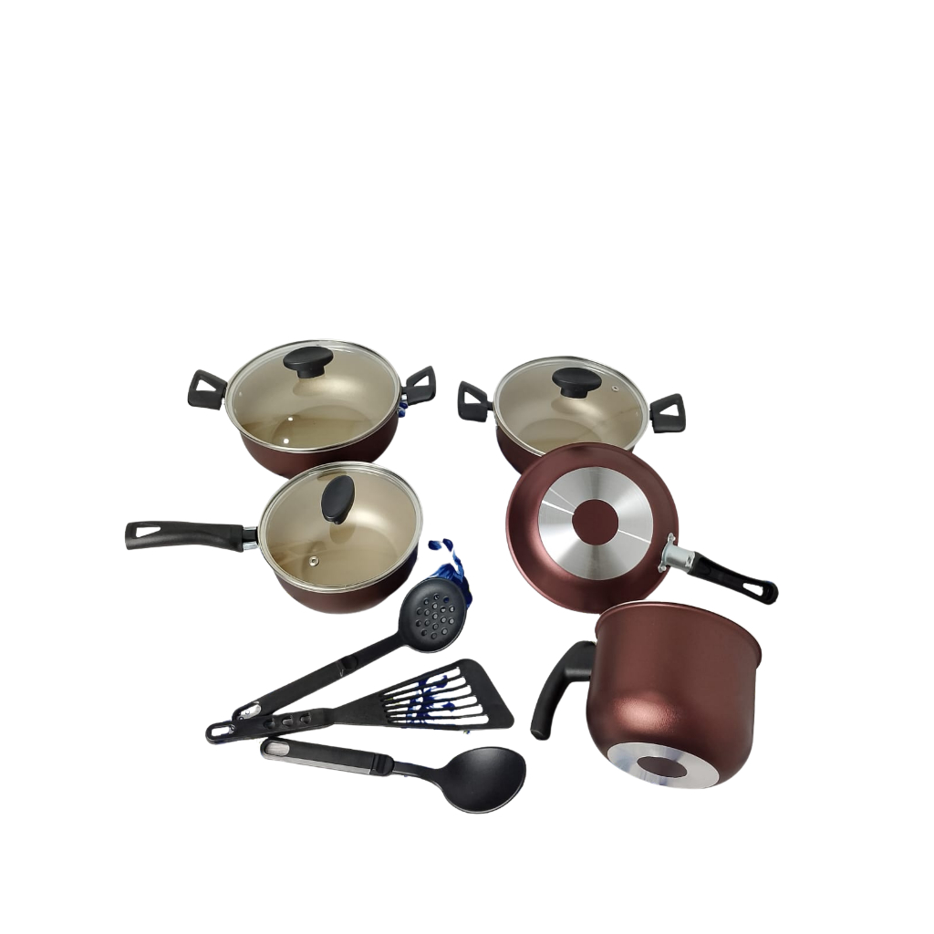Kit Panelas Antiaderentes - MARROM & BEGE com Tampas de Vidro (Jogo com 8 peças, com 5 camadas de Teflon Premium) Leve charme e funcionalidade ao seu dia a dia com esse conjunto com acabamento marrom e bege. Ideal para quem busca beleza, desempenho e limpeza fácil. O kit contém: ✅ 1 Caçarola com tampa de vidro — 18 cm (diâmetro) ✅ 1 Caçarola com tampa de vidro — 20 cm (diâmetro) ✅ 1 Panela com tampa de vidro — 16 cm (diâmetro) ✅ 1 Fervedor sem tampa — 12 cm (diâmetro) ✅ 1 Frigideira antiaderente — 20 cm ✅ 01 Colher de Nylon ✅ 01 Espátula de Nylon ✅ 01 Escumadeira Nylon Destaques do produto: 🔸 Revestimento antiaderente (fácil limpeza e menos óleo) 🔸 Acabamento MARROM & BEGE com design moderno e elegante 🔸 Cabos anatômicos — pegada segura e confortável 🔸 Tampas de vidro com saída de vapor — acompanhe o ponto do preparo sem abrir 🔸 Ideal para uso diário e receitas variadas Como fazer a cura (pré uso) — passo a passo (importantíssimo)!!! Para garantir maior durabilidade e a melhor performance do antiaderente, realize esse procedimento antes do primeiro uso: 🧼 Lave bem: lave com esponja macia, detergente neutro e água morna. Seque totalmente com pano. 🫙 Aplique uma camada fina de óleo: passe uma leve camada de óleo de cozinha (soja, milho ou girassol) por toda a superfície interna usando papel toalha ou pincel. 🔥 Aqueça em fogo baixo: coloque no fogo baixo por 2 a 3 minutos. Esse aquecimento ajuda a selar o revestimento. ❄️ Deixe esfriar naturalmente: desligue o fogo e espere a panela esfriar sozinha. 🧻 Remova o excesso: após fria, passe papel toalha para retirar qualquer excesso de óleo. 🔁 Recomenda-se repetir a cura a cada 2–3 meses, ou sempre que notar perda de antiaderência. - Cuidados e recomendações (para aumentar a vida útil) - Use esponja macia e detergente neutro. Evite palha de aço e produtos abrasivos. - Evite utensílios metálicos — prefira silicone, nylon ou madeira. - Não submeter a choques térmicos (não lavar com água fria logo após uso em fogo alto). - Cozinhe em fogo médio/baixo para preservar o revestimento. - Não utilize no forno (a menos que indicado no rótulo do produto). - Armazene com cuidado para não riscar a superfície.